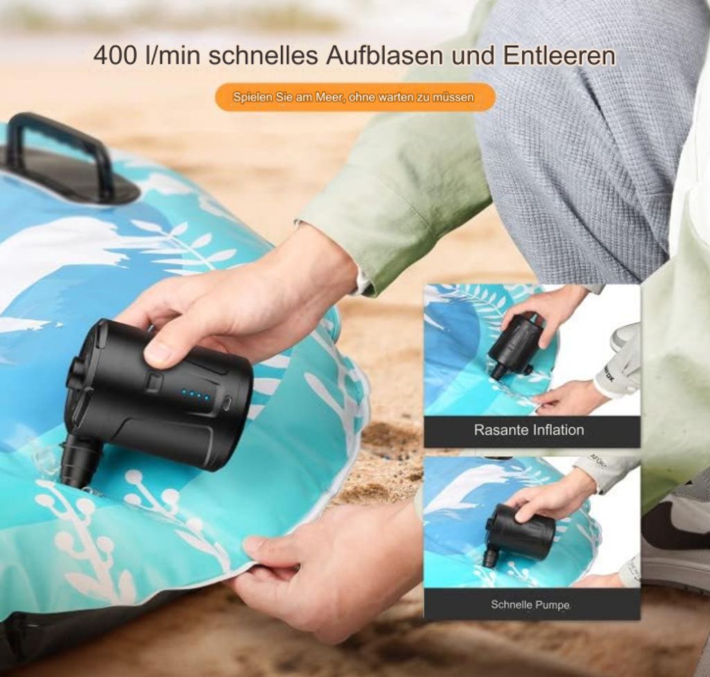 Schluss mit anstrengendem Aufblasen! Diese coole elektrische Luftpumpe mit 5200mAh Akku ist dein bester Freund für Outdoor-Abenteuer. Ob Camping, Poolparty oder Reise - mit 300L/Minute bläst sie dir alles blitzschnell auf: Luftmatratzen, Schwimmringe, Planschbecken oder sogar Yogabälle. Der starke Akku hält ewig und lässt sich bequem per USB aufladen - super praktisch unterwegs! Mit drei verschiedenen Düsen passt sie zu fast allem, was Luft braucht. Das beste: Sie ist nicht nur schnell, sondern auch sicher mit Überhitzungsschutz. Kompakt genug für jeden Rucksack und so leicht, dass du sie überall mitnehmen kannst. Nie wieder außer Puste kommen beim Aufblasen - einfach einschalten und in wenigen Sekunden ist alles fertig. Perfekt für spontane Trips oder den nächsten Gartenbesuch. Einfach genial, wie viel Zeit und Nerven du damit sparen kannst!