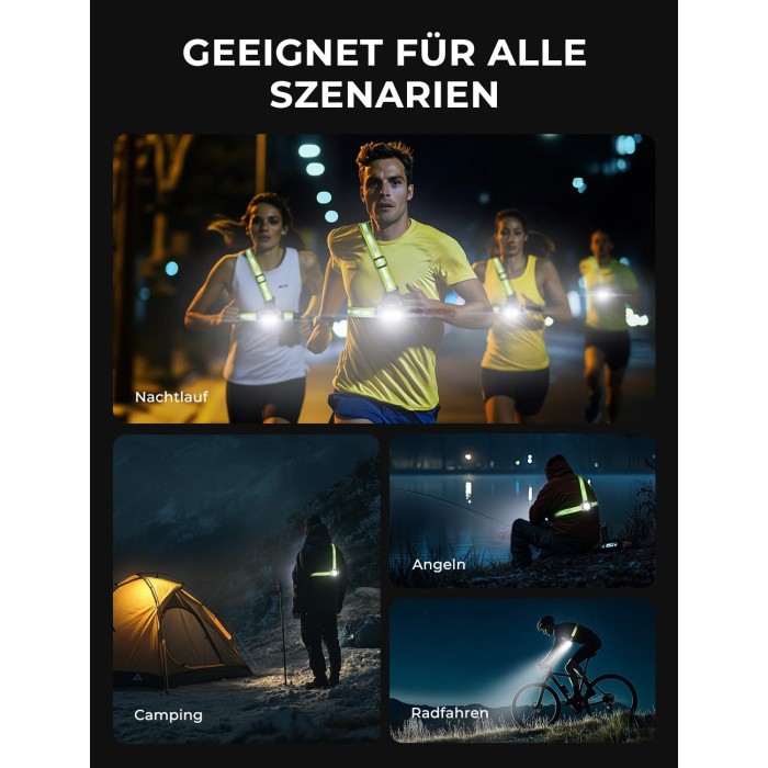 Sicherheit bei Dunkelheit - dieses Lauflicht macht dich beim Joggen oder Wandern optimal sichtbar! Mit 400 Lumen Helligkeit beleuchtet es deinen Weg perfekt, während die roten Warn-LEDs auf der Rückseite entgegenkommende Verkehrsteilnehmer warnen. Drei Lichtmodi (stark/schwach/Blink) und ein verstellbarer Neigungswinkel (90°) geben dir volle Kontrolle. Der leistungsstarke 1500mAh Akku lädt per modernem USB-C-Anschluss schnell auf und die IPX4 Wasserdichtigkeit schützt bei Regen. Im Lieferumfang sind zwei reflektierende Armbänder enthalten - für maximale Sichtbarkeit von allen Seiten. Das elastische Band passt sich jeder Körperform an und sitzt sicher und bequem. Perfekt für Jogger, Walker, Hundebesitzer oder Camper - dein zuverlässiger Begleiter für alle Outdoor-Aktivitäten bei Dunkelheit!