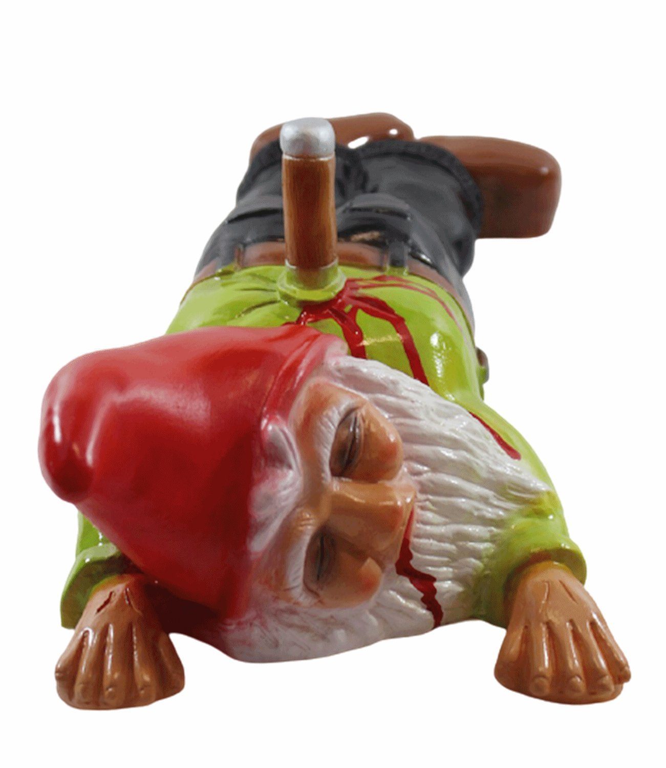 Achtung - schwarzer Humor alarm! Dieser 'erstochene' Gartenzwerg bringt definitiv jeden zum Lachen. Der arme Kerl liegt da mit einem Messer im Rücken - aber keine Sorge, das Messer ist aus Plastik und ohne scharfe Kante! Mit 45 cm Länge ist er ein echter Hingucker im Garten, auf dem Balkon oder der Terrasse. Hergestellt in Deutschland aus wetterbeständigem PVC, hält er jedem Wetter stand. Die handbemalten Details mit giftfreien Farben sehen richtig authentisch aus. Perfekt für alle, die es etwas anders mögen oder jemandem einen originellen Schrecken einjagen wollen. Ein garantiertes Gesprächsthema auf jeder Gartenparty!