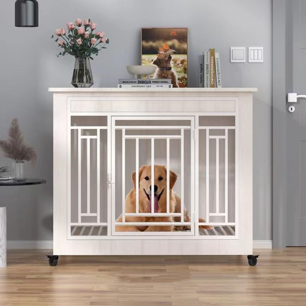 Das ist mal was Anderes - ein Hundekäfig der aussieht wie echtes Mobiliar! In schickem Vintagebraun passt dieser Hundekäfig perfekt in deine Wohnungseinrichtung. Mit verdickten Eisenröhren und massiven Laminatholzplatten ist er super stabil und kausicher. Die Tischplatte oben kannst du praktisch nutzen - für Bücher, Deko oder Hundezubehör. Innenmaße von 59,2×49,4×60 cm bieten genug Platz für kleine Hunde zum Drehen und Ausstrecken. Mitgeliefert wird ein weiches Wellpapp-Schwammpad das waschbar ist und für Komfort sorgt. Der 4,3 cm Gitterabstand ist fluchtsicher. Montage ist kinderleicht - in ca. 10 Minuten steht der Käfig. So wird der Hundekäfig zum stylischen Möbelstück das niemand als solches erkennt. Dein Hund hat sein sicheres Reich und du hast einen schicken Beistelltisch - win-win!