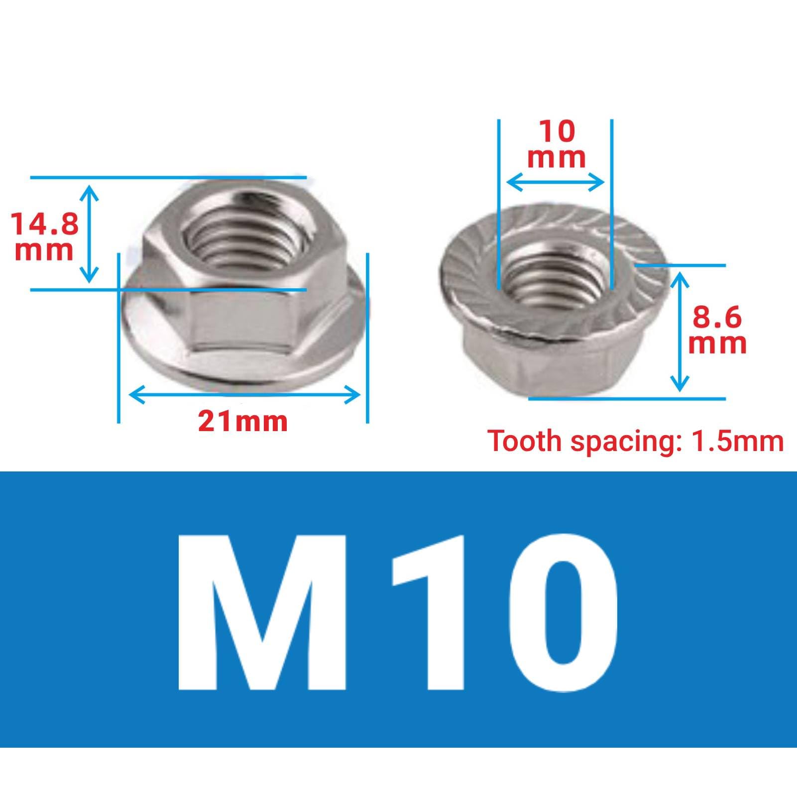 10x Flanschmuttern M10x1,5 | Edelstahl A2 - Mit Sicherungsverzahnung | Selbstsichernd