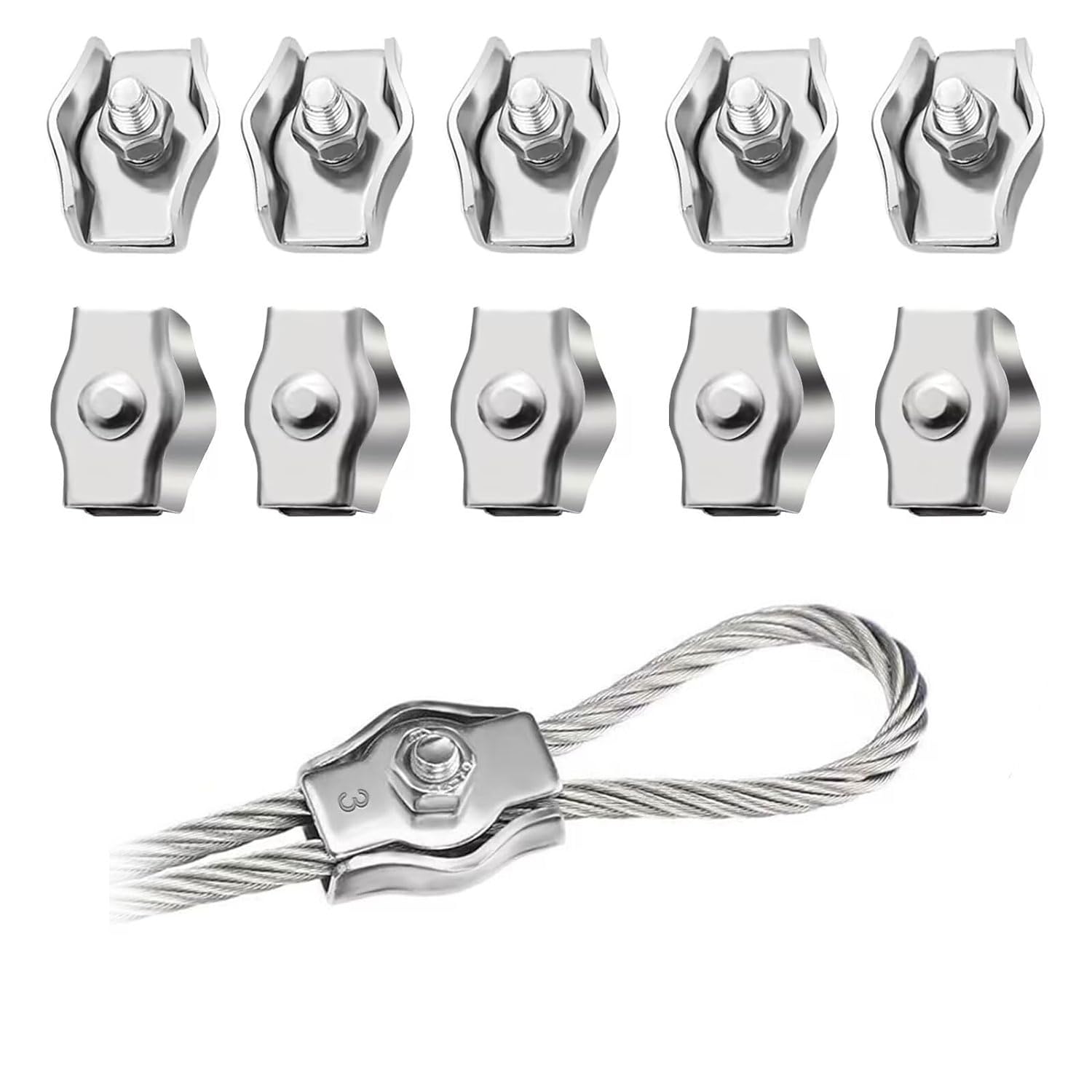 Sichere Verbindungen für deine Stahlseile! Dieses Set mit 10 Edelstahl-Drahtseilklemmen M3 ist perfekt für 3mm Seile. Aus hochwertigem 304 Edelstahl - rostfrei und langlebig. 🔩\n\nJede Klemme besteht aus:\n• Bolzen\n• Mutter\n• Unterlegscheibe\n\nDas tiefe Gewinde sorgt für stabilen Halt und verhindert Rutschen. Einfach zu montieren und wiederzuverwenden - ohne Spezialwerkzeug!\n\nEinsatzbereiche:\n• Markisen und Sonnensegel\n• Wäscheleinen-Spanner\n• Abgehängte Decken\n• Zauntore und Geländer\n• Fahnen und Banner\n• Industrie und Bauwesen\n• Schifffahrt und Transport\n\nDie Klemmen sind ideal zum Erstellen von Schlaufen an Drahtseilen oder zum Verbinden von Seilenden. Perfekt für Heimwerker, Handwerker und Profis.\n\nMit 10 Stück im Set hast du genug für mehrere Projekte oder Ersatz. Edelstahl 304 hält auch bei Feuchtigkeit und ist korrosionsbeständig - made to last!
