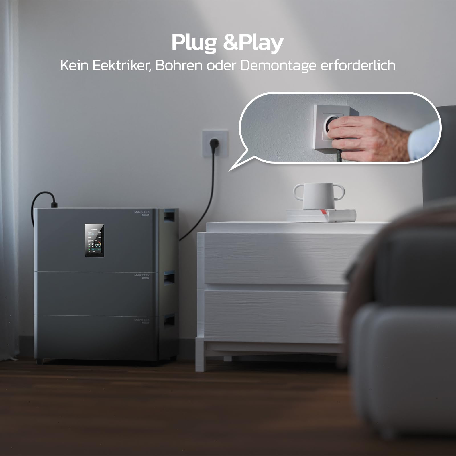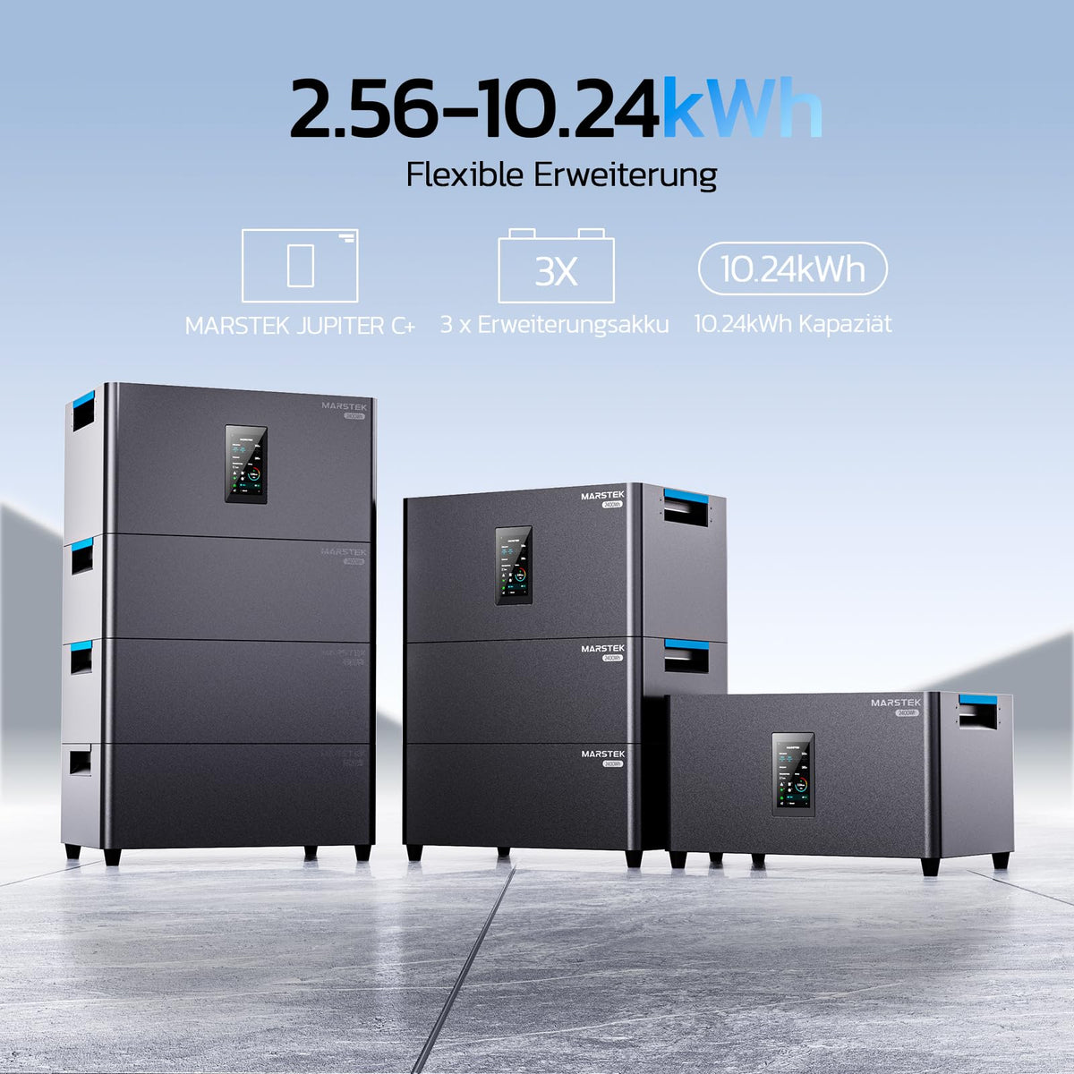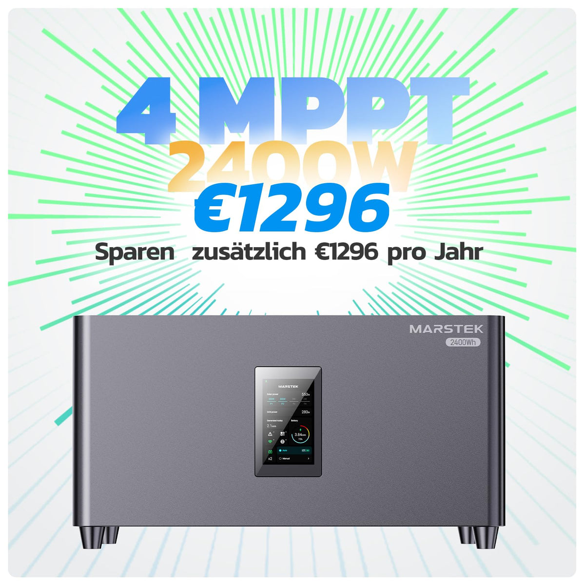 Produziere deinen eigenen Strom - ganz einfach! Dieses MARSTEK Balkonkraftwerk ist alles in einem: Wechselrichter, 2.56kWh LFP-Akku und Solarsteuerung. Bis zu 946€ Stromkosten sparst du damit pro Jahr! Mit 4 MPPT Eingängen und 2400W Solarleistung holst du das Maximum aus der Sonne raus. Einfach aufstellen, ans Stromnetz und los geht's - kein Elektriker nötig! Die App zeigt dir alle Daten in Echtzeit. Akku mit 6000 Ladezyklen und 15 Jahren Lebensdauer. Erweiterbar bis 10.24kWh - perfekt für Mieter und Hausbesitzer!