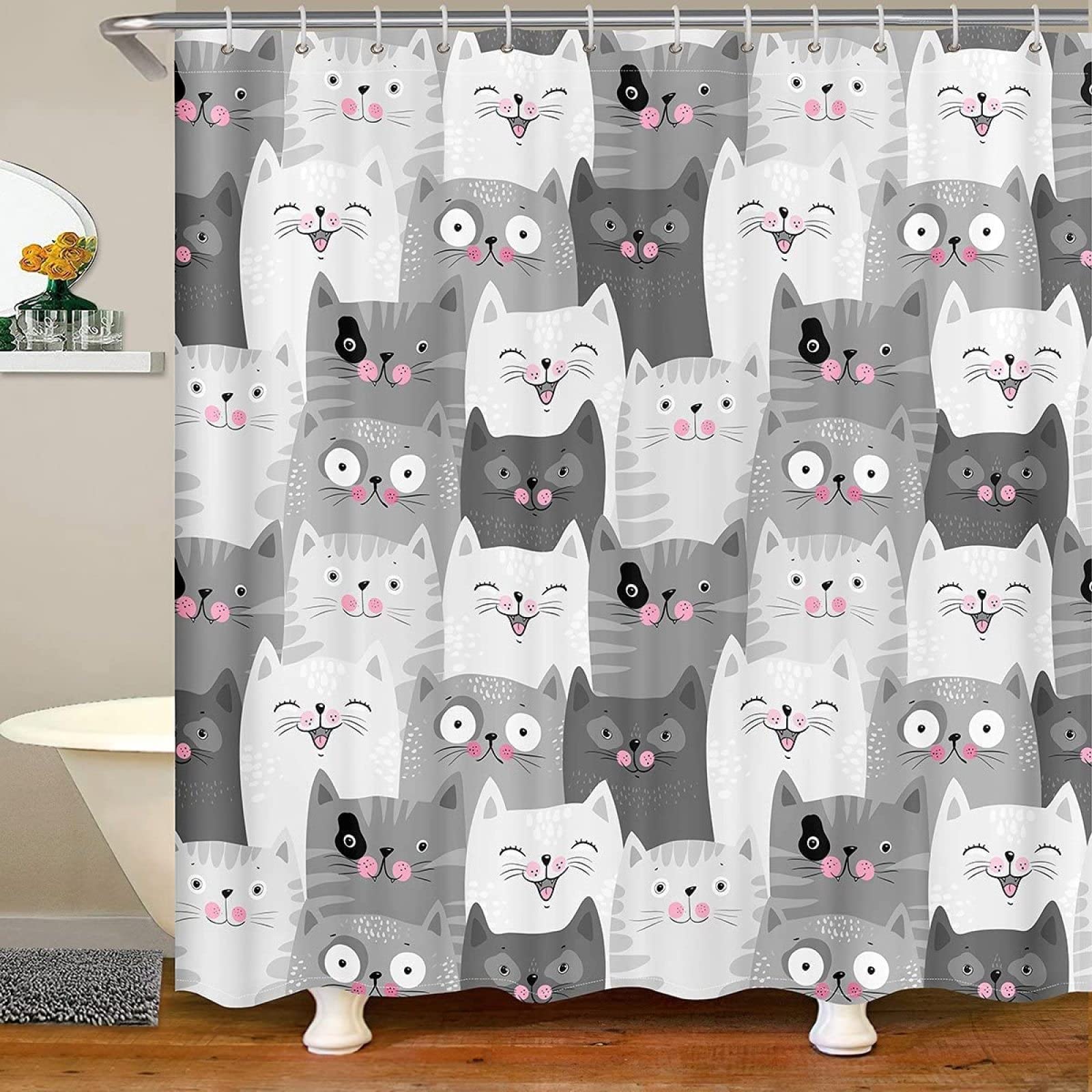 Wow, dieser Duschvorhang macht dein Badezimmer zum echten Hingucker! Das lebendige 3D-Katzen-Muster sieht so realistisch aus, dass man fast meint, die Samtpfoten würden gleich durch den Vorhang springen. \\n\\nMit 200x200cm passt er perfekt für die meisten Standard-Duschen und Badewannen. Das Polyester-Material ist nicht nur super wasserabweisend, sondern auch schimmelresistent - perfekt für feuchte Badezimmer! \\n\\nWas dich erwartet: \\n• Knalliger 3D-Druck der richtig was her macht \\• 12 robuste Metallhaken inklusive \\n• Einfache Montage - einfach aufhängen und fertig \\n• Wasserdicht und schnell trocknend \\n• Maschinenwaschbar bei 30°C \\n• Atmungsaktiv und umweltfreundlich \\n\\nDer Vorhang schützt nicht nur deine Privatsphäre, sondern ist auch ein echter Eyecatcher. Ob fürs Gäste-WC, das Familienbad oder die eigene Wohnung - dieser Katzen-Vorhang bringt Leben in jedes Badezimmer! \\n\\nEinfach in die Waschmaschine stecken, wenn's mal nötig ist - die Farben bleiben knallig und das Material in Form. Badezimmer-Spaß garantiert!