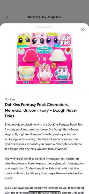 Die DohKins Unicorn Knete von MGA Entertainment macht einfach riesig Spaß! Die Never-Dry Dough trocknet niemals aus - sie bleibt immer weich und riecht dazu auch noch super. Jede Figur hat ihren eigenen unverwechselbaren Duft, das ist doch mal was! Mit den drei Spielmöglichkeiten wird es nie langweilig: Herstellen! Formen! Gestalten! Die beiliegenden Formen machen es ganz einfach, lustige Figuren zu kreieren. Und wenn die Spielzeit vorbei ist, dienen die Figuren-Formen gleich als praktische Aufbewahrung - alles bleibt schön zusammen. Die Knete ist komplett glutenfrei und für sicheres Spielen getestet, perfekt für Kinder von 2-5 Jahren. Mit den Aufbewahrungsbehältern und den Mustern auf der Burg kannst du die Knete ausrollen, formen und prägen. Das Presswerkzeug kreiert coole Eiscreme-Wirbel - wie im Eiscafé! Dieses taktile Spielerlebnis fördert die Kreativität und trainiert die Feinmotorik. Einfach perfekt für kleine Künstler und alle, die gerne mit ihren Händen werken. Sechs verschiedene Figuren zum Sammeln - welches wird dein Liebling? Hol dir den Knetspaß, der niemals endet!