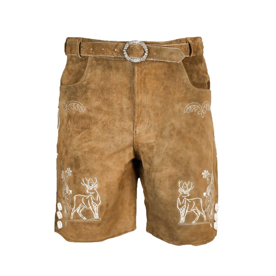 Echt bayerisches Flair für dein nächstes Fest! Diese kurze Lederhose \Georg\ von MS-Trachten in schönem Braun mit Antik-Optik ist ein echter Hingucker. Aus weichem, hochwertigem Glattleder gefertigt, sitzt sie sich super bequem. Mit traditionellen Stickereien, Messertasche und praktischem Knopfverschluss am Beinabschluss. Das leichte Futter aus 100% Polyester sorgt für angenehmen Tragekomfort. Und das Beste: Ein passender Ledergürtel ist bereits im Lieferumfang enthalten! Perfekt für Oktoberfest, Volksfeste oder Hochzeiten. Mit zwei Vordertaschen und Gesäßtasche hast du alles Wichtige griffbereit. Hol dir jetzt diesen zeitlosen Klassiker und sei der Star auf jedem Fest!