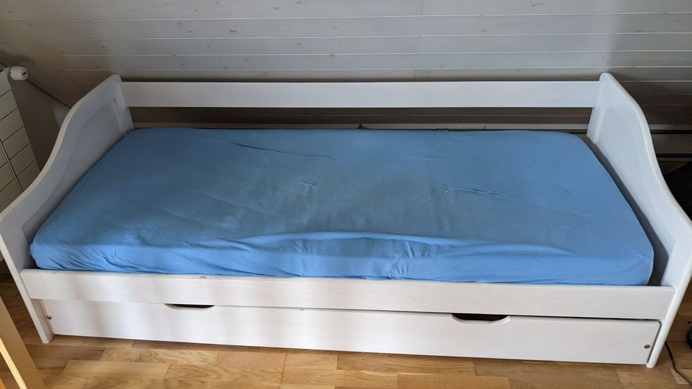 Wow, dieses Bett ist echt ein Alleskönner fürs Kinderzimmer! 90x200cm Standardgröße, aber mit mega vielen Extras: Integrierter Schreibtisch zum Hausaufgaben machen, ausziehbares Gästebett für Übernachtungspartys UND drei seitliche Regale für Bücher und Spielzeug. Aus massivem Kiefernholz und MDF - stabil und hält was aus (bis 140kg!). Die 8 Lattenroste geben deiner Matratze super Halt. Besonders praktisch: Der Schreibtisch kann sowohl am Kopfende als auch am Fußende montiert werden - je nachdem wie's am besten passt. Das Ausziehbett trägt 80kg, also auch für größere Geeignete kein Problem. Maße: 241,9cm lang, 112cm breit, 73cm hoch - passt in die meisten Kinderzimmer. Matratze sollte 15-20cm dick sein. Wichtig: Wird in zwei Paketen geliefert, die manchmal an unterschiedlichen Tagen ankommen - kein Stress, das ist normal! Aus Vietnam, aber deutscher Service. Mach deinem Kind eine Freude und schenk ihm sein eigenes kleines Reich - zum Schlafen, Lernen und Spielen!