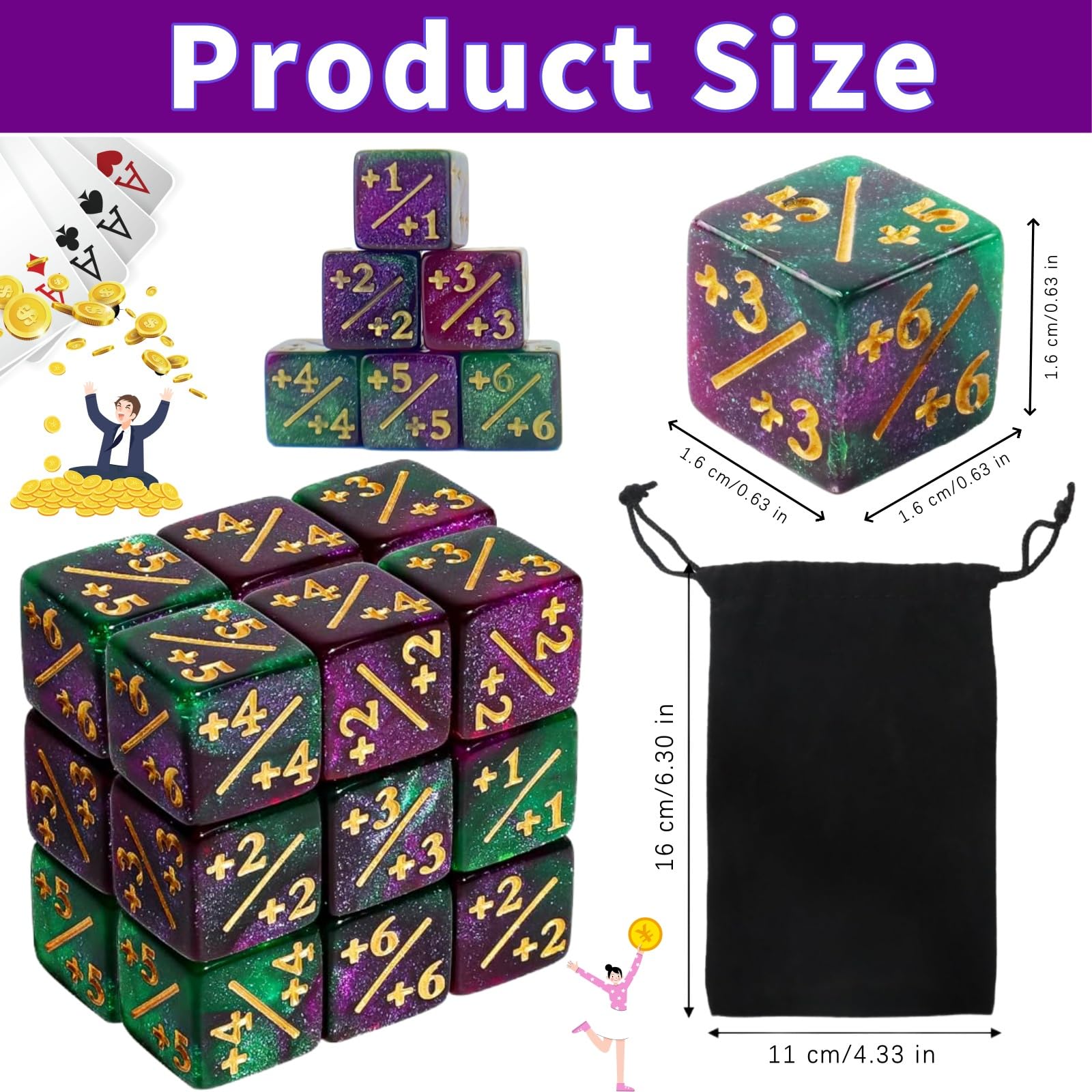 Perfekt für deine nächste Magic the Gathering Runde! Dieses mega umfangreiche 53-teilige Würfel-Set hat alles, was du brauchst! Enthalten sind: 24 schwarze MTG-Schlüsselwortwürfel für alle wichtigen Spielzüge, 24 bunte Würfelzähler in 4 verschiedenen Farben, 3 große d20-Würfel für Life-Counter, 1 stylischer Leder-Würfelnapf und 1 praktischer Samtbeutel für den Transport! Alles aus hochwertigem Acryl - stabil, langlebig und mit klaren, gut lesbaren Aufdrucken! Die Würfel messen ca. 1.6x1.6x1.6cm - perfekt in der Hand! Nicht nur für MTG, sondern auch für andere TCGs, RPGs und Brettspiele super geeignet! Der Ledernapf sieht nicht nur cool aus, sondern macht das Würfeln auch viel angenehmer! Alles sicher verpackt im Samtbeutel (12x15cm) - ideal für unterwegs zu Turnieren, Spieleabenden oder Conventions! Mach dein Spiel-Setup komplett und beeindrucke deine Mitspieler! Auch ein tolles Geschenk für jeden Tabletop- und Kartenspiel-Fan! Mit diesem Set bist du für jede Spielsituation bestens ausgerüstet! Hol dir jetzt dieses professionelle Würfel-Set und bring dein Gaming auf das nächste Level!