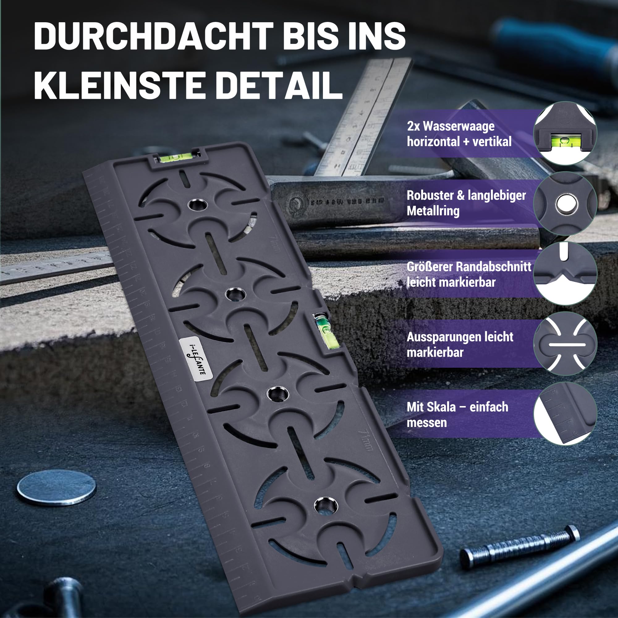 Schluss mit krummen Steckdosen! Diese MaKoen Bohrschablone macht dich zum Profi in Sachen Elektroinstallation. Einfach anzeichnen, bohren, fertig - so schnell war noch keine Steckdose montiert! Die exakten 71mm Bohrungen nach DIN-Norm sorgen für perfekte Passgenauigkeit bei Hohlwand- und Unterputzdosen. Die integrierte Wasserwaage mit zwei Libellen hilft dir, die Schablone absolut waagerecht oder senkrecht auszurichten - kein zusätzliches Werkzeug nötig! Die 6mm starken, gehärteten und verzinierten Stahlhülsen garantieren saubere Bohrlöcher und lange Haltbarkeit. Made in Germany - da steckt echte Qualität drin! Ob du Elektriker oder Heimwerker bist - mit dieser Schablone wird jede Installation zum Kinderspiel. Robust konstruiert für den täglichen Einsatz in Werkstatt und auf Baustelle. Nie wieder ärgerlich über schiefe Steckdosen - einfach die Schablone ansetzen und loslegen! Dein neuer bester Helfer für alle Elektroarbeiten!