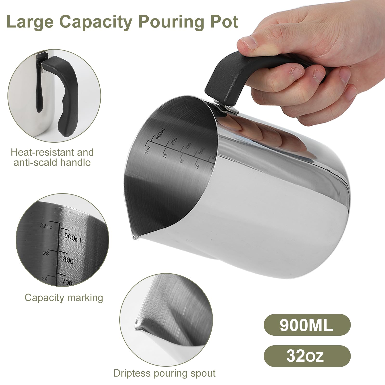 Entdecke die kreative Welt der Kerzenherstellung! Dieses Komplett-Set hat alles, was du brauchst: 900ml Edelstahl-Schmelztopf mit Skala, temperaturregelbare Heizplatte (5 Stufen), Thermometer, Dochthalter, Rührlöffel und rutschfeste Matte. Der Topf aus 304 Edelstahl ist rostfrei und hat einen praktischen Ausgießer. Die Heizplatte heizt von 40°C bis 240°C - perfekt für Wachs, aber auch für Schokolade oder Seife! Einfache Bedienung, ideal für Anfänger. Mach wunderschöne personalisierte Kerzen für dich oder als Geschenk! Inhalt: 1x Topf, 1x Heizplatte, 2x Dochthalter, 1x Thermometer, 1x Rührlöffel, 1x Matte