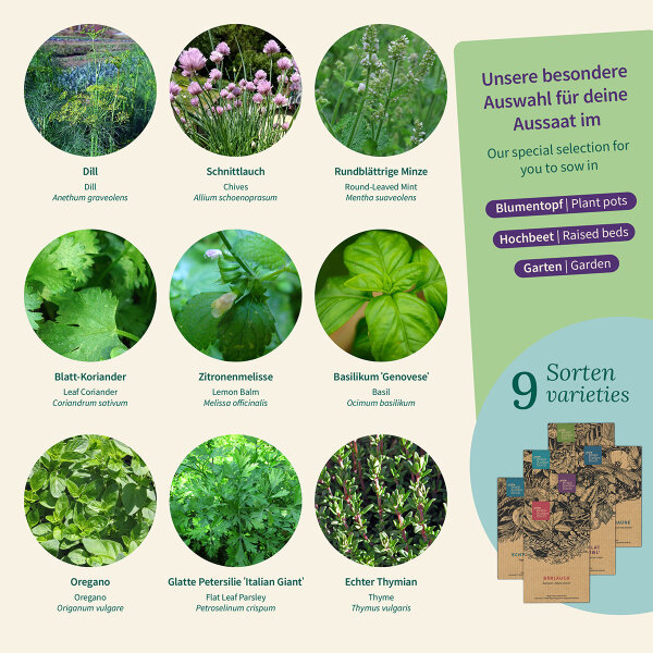 Frische Kräuter immer griffbereit – auch ohne Garten! Dieses zauberhafte Set enthält Samen für 9 beliebte Küchenkräuter: Dill, Oregano, Koriander, Zitronenmelisse, Petersilie, Basilikum, Schnittlauch, Thymian und Apfelminze. Alles platzsparend im Topf oder Balkonkasten anbaubar. Inkl. farbig illustrierter Geschenkbox und QR-Code mit Anleitung in 5 Sprachen. Ideal für Anfänger und erfahrene Gärtner. Einfach aussäen, pflegen und ernten – deine Gerichte werden es dir danken!
