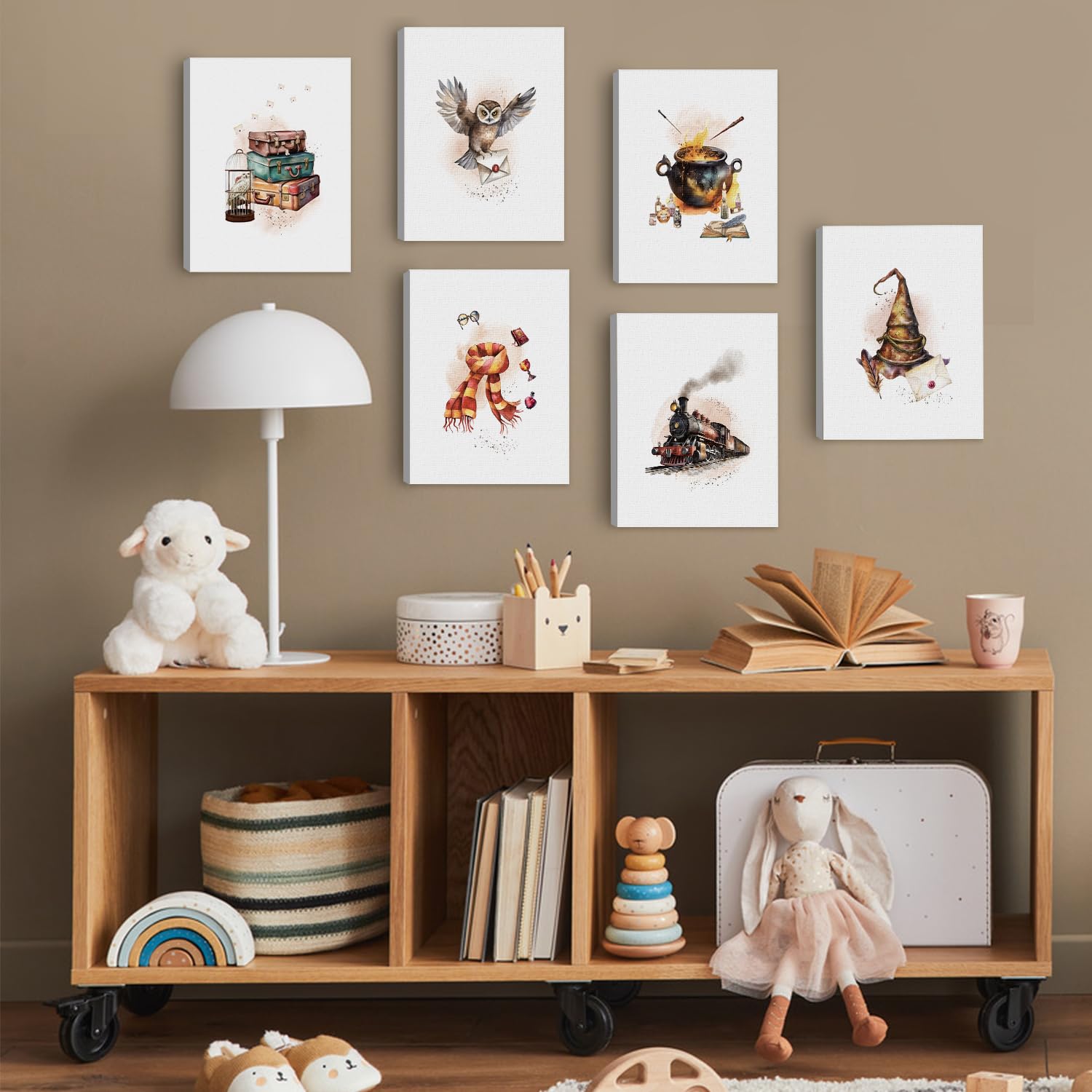 Abrakadabra! Verwandele das Kinderzimmer in eine magische Welt mit diesem bezaubernden Leinwandbild! Die Eule, der fliegende Besen und der geheimnisvolle Bahnsteig entführen dich in die Welt der Zauberer.