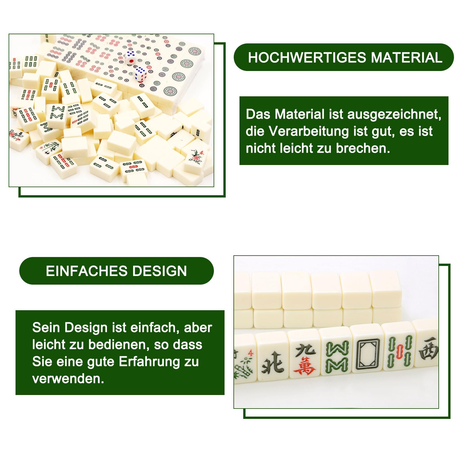 Asiatischer Spiele-Spaß für unterwegs! Dieses kompakte Mahjong-Set von Glixoft bringt den traditionellen Spieleklassiker in dein Wohnzimmer. Mit 144 Steinen, 2 Würfeln und einer praktischen Tragetasche ist alles dabei, was du für stundenlangen Spielspaß brauchst. Die Steine aus hochwertiger Faserplatte haben abgerundete Ecken und liegen gut in der Hand. Perfekt für Familienabende, Partys oder gemütliche Spiele-Runden mit Freunden. Das kompakte Design (23,7x17,5x4,5cm) macht es zum idealen Reisebegleiter. Trainiere dein logisches Denken und tauche ein in die faszinierende Welt des Mahjong!