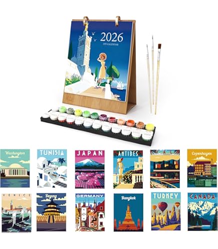 Wow, was für eine coole Idee! Dieser Malen nach Zahlen Kalender für 2026 macht Planung zum echten Kunst-Erlebnis. Statt langweiliger Monatsblätter malst du dir jeden Monat dein persönliches Kunstwerk! Im Set ist alles dabei: Der Kalender selbst, Acrylfarben in allen benötigten Farben und sogar 3 verschiedene Pinsel. Einfach die Zahlen ausmalen und schon entstehen traumhafte Motive! Perfekt fürs Homeoffice, das Kinderzimmer oder als Geschenk für kreative Freunde. Mit 31x18,6cm hat er die perfekte Größe für jeden Schreibtisch. Mach dir das Jahr 2026 zum persönlichen Kunstprojekt - viel entspannender als jeder normale Kalender! Und das Beste: Am Ende des Jahres hast du nicht nur Termine im Blick, sondern auch 12 selbstgemalte Bilder, auf die du stolz sein kannst.