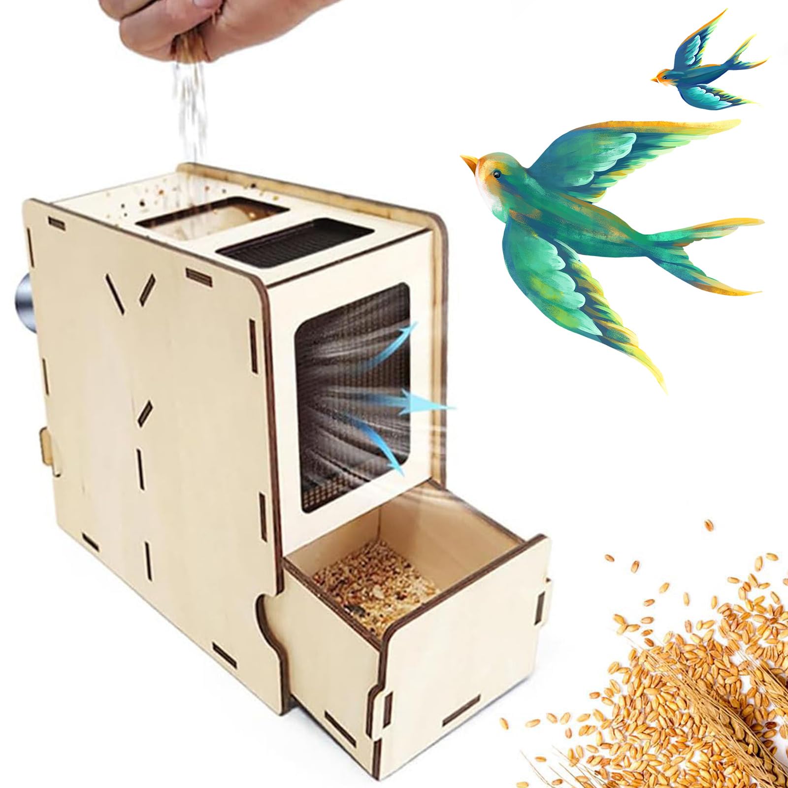 Diese praktische Vogelfutter-Maschine aus Holz macht die Fütterung deiner Vögel viel einfacher und sauberer! Trennt mühelos Spelzen und Hülsen von Hirse und anderen kleinen Körnern. Komplett manuell betrieben - keine Elektrizität nötig. Einfach die Körner einfüllen und entweder pusten oder schütteln - die leichten Spelzen werden weggeblasen während die guten Körner unten bleiben. Aus umweltfreundlichem Holz, ca. 22x9x18cm groß und 414g leicht. Perfekt für Vogelzüchter, -halter oder kleine Farmen. Reduziert Verschwendung und sorgt für bessere Verdauung bei deinen gefiederten Freunden. Einfach zu bedienen, traditionelles Handwerk mit modernem Nutzen. Deine Vögel werden es dir danken!
