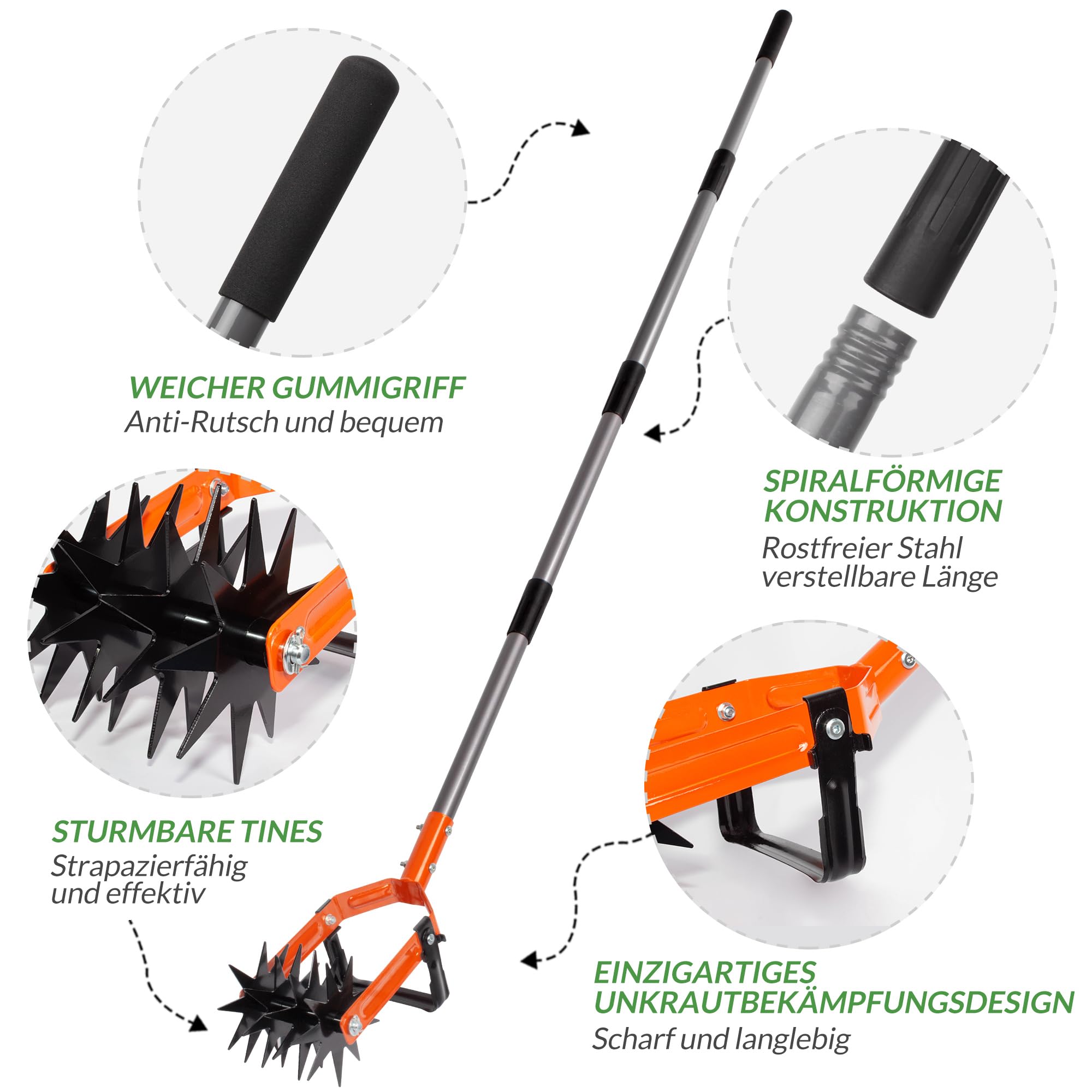 Für alle Hobby-Gärtner: Diese handliche Gartenfräse macht die Bodenarbeit zum Kinderspiel! Nur 27cm lang und 230g leicht - liegt perfekt in der Hand. Aus robustem ABS-Material, das was aushält. Perfekt zum Lockern von Erde, Belüften des Bodens, Ziehen von Beeträndern oder Umtopfen von Pflanzen. Der Antriebsmechanismus spart Kraft und Zeit - einfach drehen und die Erde wird fein krümelig. Besonders praktisch in engen Beeten oder Ecken, wo große Geräte nicht hinkommen. Verbessert die Bodenqualität, fördert das Wurzelwachstum und macht deine Pflanzen glücklicher. Ob im Gemüsebeet, Blumenkasten oder für die Rasenpflege - dieses vielseitige Tool ist immer einsatzbereit. Einfach in der Handhabung, ohne Strom oder Benzin - pure Gartenfreude!