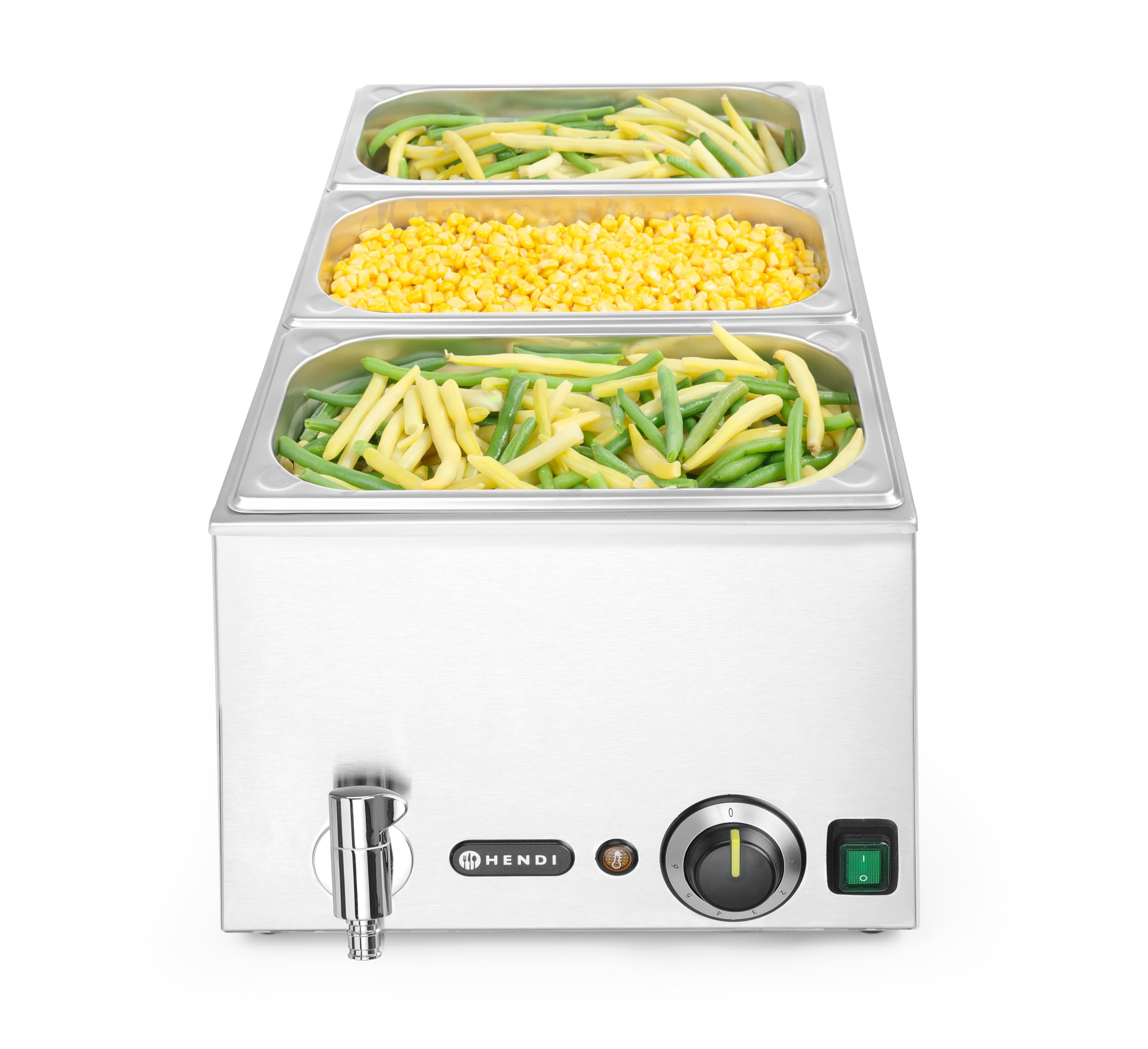 Perfekt für die Gastronomie - dieses HENDI Thermosystem hält deine Speisen und Saucen stundenlang auf der idealen Temperatur! Mit zwei großen 4-Liter-Töpfen aus Edelstahl und separaten Deckeln. Das Gehäuse und der Wassertank sind ebenfalls aus robustem Edelstahl. Die 6-stufige Temperaturregelung von 30°C bis 85°C ermöglicht dir die perfekte Einstellung für jedes Gericht. Mit Kontrollleuchte siehst du sofort wenn geheizt wird. Die Anti-Rutsch-Füße sorgen für sicheren Stand. Maße: 506x312x298mm, Leistung 400W bei 230V. Achtung: Dies ist ein Profi-Gerät für den gewerblichen Einsatz! Damit bleiben deine Suppen, Saucen und Speisen immer servierbereit - ohne anbrennen oder auskühlen.