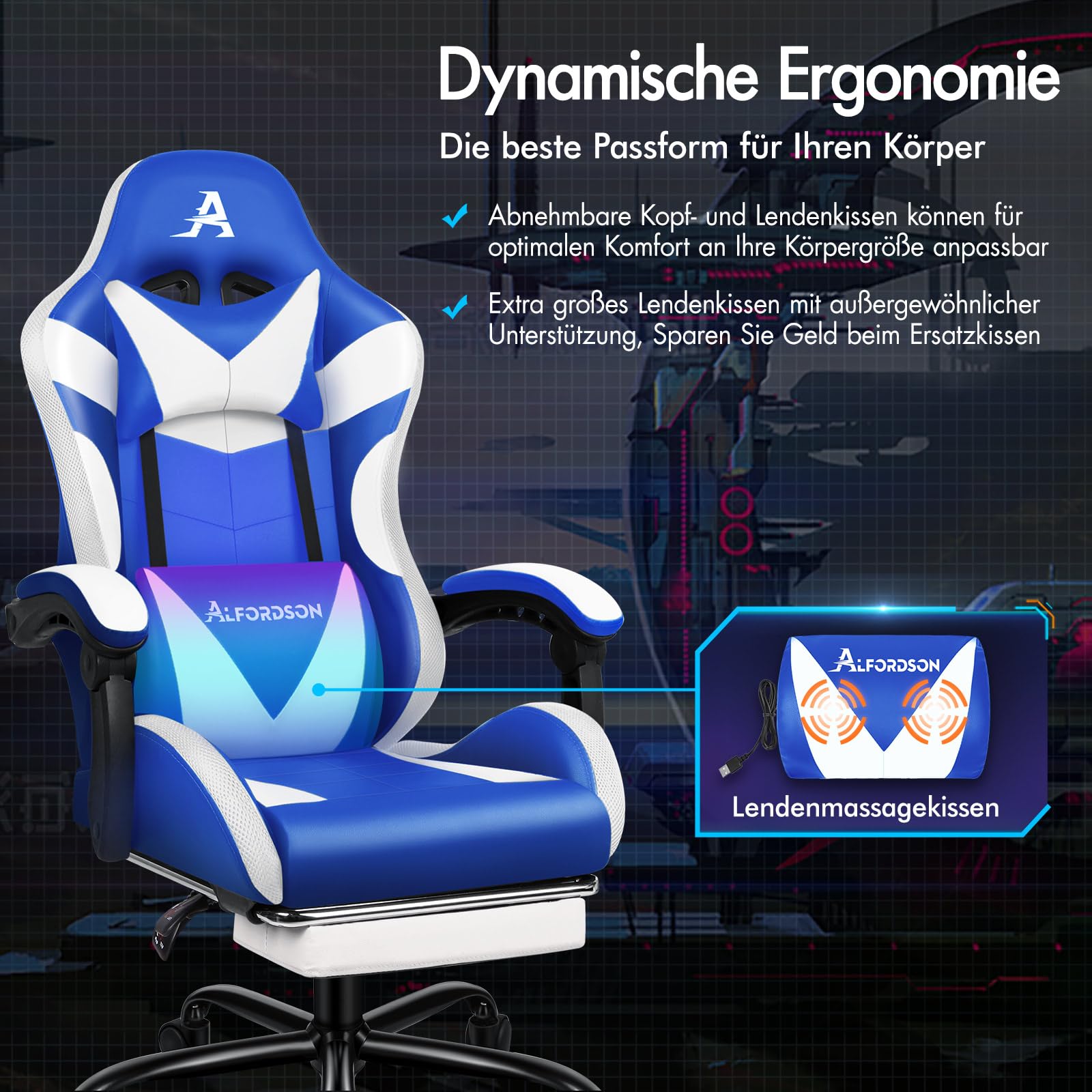 Dieser ALFORDSON Gaming Stuhl ist pure Sitz-Luxus! Mit 8-Punkt-Massagefunktion im extra großen Lendenkissen entspannst du dich nach langem Sitzen oder Gaming-Sessions. Einfach per USB aufladen und die Massage genießen! Der Stuhl hat eine ausziehbare Fußstütze, ist 360° drehbar und neigbar von 90° bis 150°. Die Sitzhöhe lässt sich von 51-61cm verstellen, und die Kopf- und Lendenkissen sind anpassbar. Aus hochwertigem PU-Leder und mit robuster Gasdruckfeder hält er bis zu 180kg aus. Die ergonomische S-Form der Rückenlehne sorgt für perfekte Wirbelsäulenunterstützung. Mit verstellbaren Armlehnen und leichtgängigen Rollen ist dieser Stuhl ein Traum für jeden, der viel sitzt. Ob zum Zocken, Arbeiten oder Entspannen - hier sitzt du wie ein König!