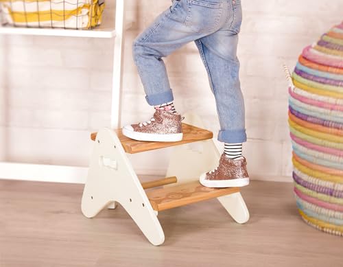 Dieser Tritthocker aus Massivholz macht Kinder zu kleinen Selbstständigkeits-Profis! Mit zwei rutschfesten Stufen erreichen die Kleinen problemlos Waschbecken, Toilette oder die Arbeitsplatte in der Küche. Die rutschfeste Oberfläche gibt auch mit Socken sicheren Halt. Im schicken skandinavischen Design passt der Hocker in jedes Badezimmer oder Kinderzimmer. Einfach zusammenzubauen und super stabil - so macht Selbstständigkeit Spaß!