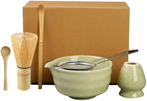 Perfekt für Matcha-Einsteiger und Kenner! Dieses 6-teilige Set enthält alles, was du für die traditionelle Matcha-Zubereitung brauchst: Bambus-Besen (Chasen), Bambus-Löffel (Chashaku), Keramik-Schale mit Ausguss, Sieb, Teelöffel und Besenhalter. Der Bambus-Besen schlägt den Tee schön schaumig, ohne bitteren Metallgeschmack. Die Keramik-Schale sieht nicht nur elegant aus, der praktische Ausguss macht das Ausgießen super einfach. Alles sorgfältig verarbeitet - damit wird Matcha-Trinken zum echten Erlebnis. Tauche ein in die japanische Tee-Kultur!