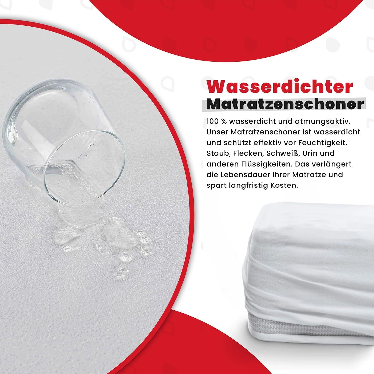 Schlaf entspannt - deine Matratze ist sicher! Diese wasserdichte Matratzenauflage schützt zuverlässig vor Flecken, Flüssigkeiten und Schmutz. Mit 30 cm Hochnesselfähigkeit passt sie auf Matratzen von 5-28 cm Dicke. Das 3-Schichten-Material (Baumwolle oben, Polyesterfaser Mitte, Membran unten) ist atmungsaktiv und hautfreundlich. Rutschfester Sitz dank elastischer Ränder und tiefer Taschen. Einfach in der Waschmaschine zu reinigen - immer frisch und hygienisch. Ideal für Familien mit Kindern, Allergiker oder wenn mal was daneben geht. Auch super für Gästebetten oder Mietwohnungen. Deine Matratze bleibt wie neu - und du schläfst beruhigt! Verfügbar in vielen Größen von 80x200cm bis 200x220cm. Mach deine Matratze fit für alle Lebenslagen - ob nachtschwitzende Sommer oder verspielte Kinderzimmer.