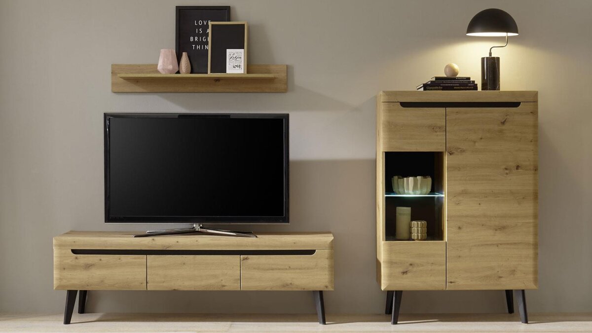 Wohnwand Set 3-tlg Matt Schwarz - Modernes Lowboard Mit Vitrine Für Wohnzimmer