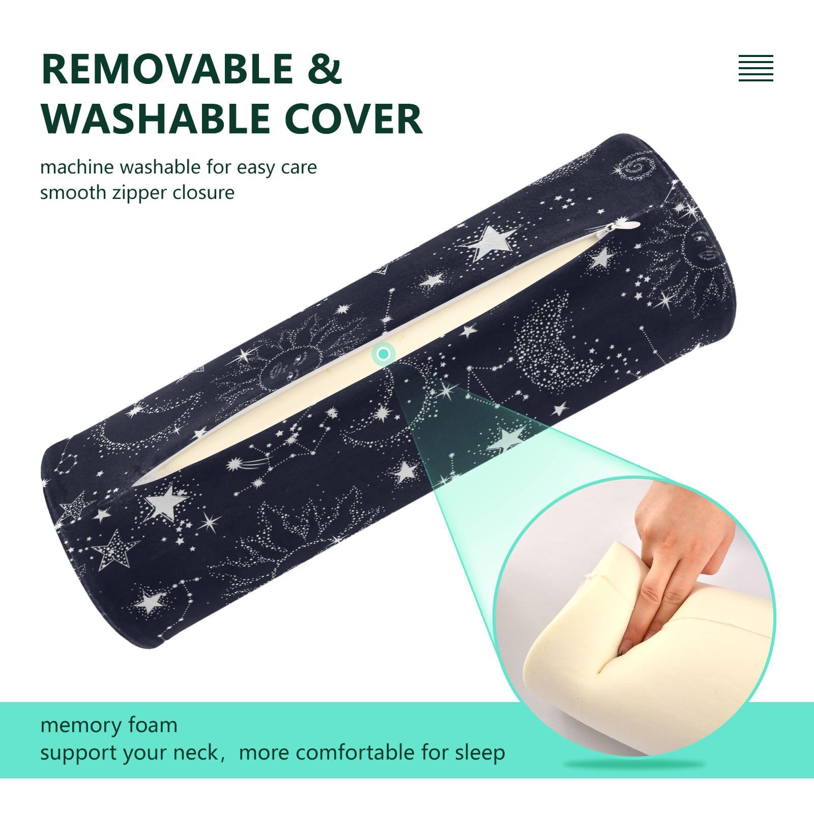 Endlich erholsam schlafen und entspannen! Diese Nackenrolle aus Memory-Schaum passt sich perfekt deiner Wirbelsäule an und sorgt für optimale Unterstützung. Mit süßem Sternen-, Sonnen- und Mond-Motiv sieht sie nicht nur gut aus, sondern hilft auch bei Nacken-, Schulter- und Rückenbeschwerden. Der Bezug aus Polyester ist mit Reißverschluss und kann leicht abgenommen und gewaschen werden. Super vielseitig: nicht nur für den Nacken, sondern auch als Unterstützung für Knie, Knöchel oder als Lendenkissen für Stühle. Perfekt für zu Hause, Reisen, Auto, Büro oder Yoga-Studio. Ein tolles Geschenk für alle die mehr Entspannung im Alltag brauchen!