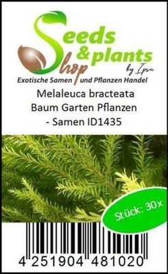 Grüner Daumen gesucht? Mit diesen 30 Melaleuca bracteata Samen holst du dir ein Stück Australien in deinen Garten! Der Schwarzteebaum wird bis zu 10 Meter hoch und begeistert mit seinen weißen, flaschenbürstenartigen Blüten. Perfekt für tropische und warm-gemäßigte Regionen - der Baum liebt Küstengebiete und Flussufer. Die Samen sind frisch geerntet, handverlesen und kommen mit einer Aussaat-Anleitung. Einfach einpflanzen und beobachten, wie aus den kleinen Samen ein stattlicher Strauch oder Baum wird. Die gelblich-grünen, nadelartigen Blätter sehen total exotisch aus. Übrigens: Wir von Seeds & Plants Shop by Ipsa haben über 35.000 verschiedene Samen im Sortiment - da ist für jeden Pflanzenliebhaber was dabei. Die Samen werden sicher verpackt und mit Sendungsverfolgung verschickt. Also, worauf wartest du? Starte dein nächstes Gartenprojekt mit diesen besonderen Samen!