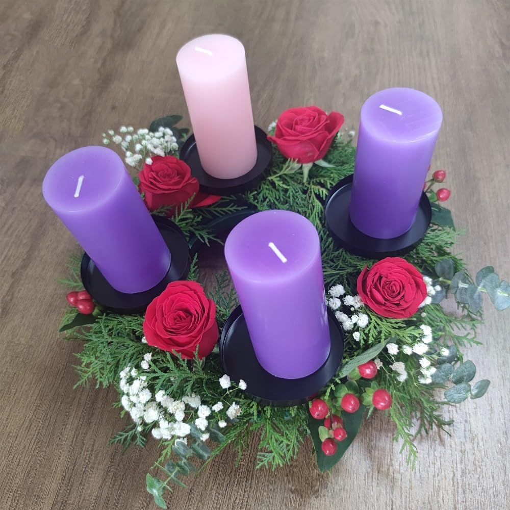 Weihnachtliche Stimmung garantiert! Diese 4 schwarzen Kerzenhalter aus Metall verwandeln deinen Adventskranz oder Weihnachtskranz in eine festliche Augenweide. Jeder Halter hat 8 cm Durchmesser und 7 cm lange Stifte - perfekt für die meisten Stumpenkerzen, Stabkerzen oder sogar LED-Kerzen. Aus hochwertigem Eisen gefertigt, stehen sie stabil und sehen dabei total edel aus. Die längeren Stifte geben deinen Kerzen extra Halt - super praktisch! Ob auf dem Esstisch, im Wohnzimmer oder als Teil deiner Weihnachtsdekoration - diese Halter sorgen für diese gemütliche Vorweihnachtszeit-Atmosphäre, die wir alle lieben. Einfach die Kerzen reinsetzen und den Zauber genießen!
