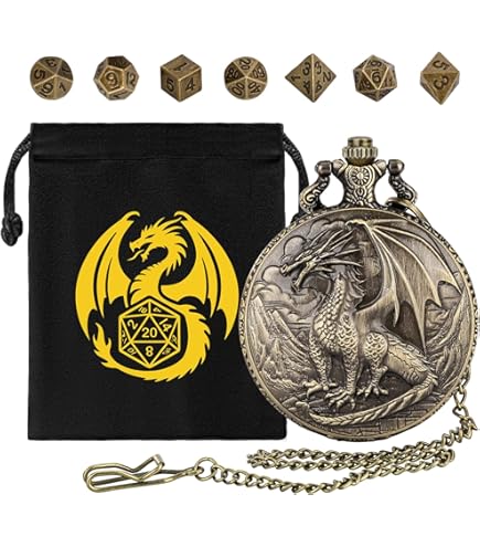 Alter, das ist ja mal ein krasses Set für alle Rollenspiel-Fans! Steampunk-Taschenuhr mit coolem Drachen-Design, 45 mm Durchmesser. Darin: 7 metallene Polyeder-Würfel für D&D und andere Tabletop-Spiele. Aus Zinklegierung - mega stabil. Mit zwei Ketten (80 cm und 38 cm) und Schwammkissen zum Schutz. Kommt in ner vergoldeten Geschenkbox mit Grußkarte - perfekt für Geburtstage, Weihnachten oder Vatertag. Super transportabel, passt in jede Tasche. Ob du Dungeon Master oder Neuling bist - damit machst du was her! Die Würfel sind genau das richtige Gewicht und liegen gut in der Hand. Einfach ein geniales Geschenk für alle Fantasy- und Steampunk-Fans!