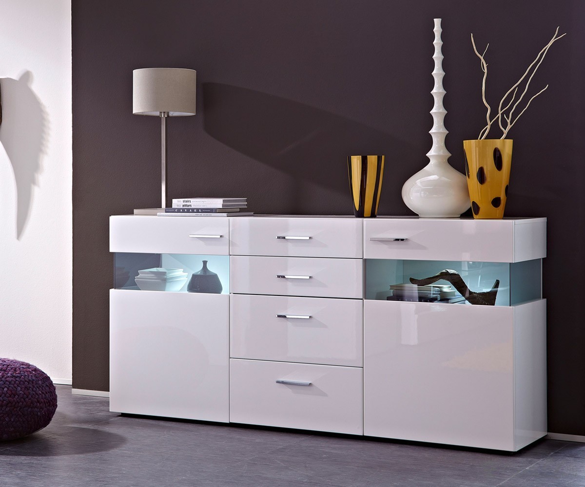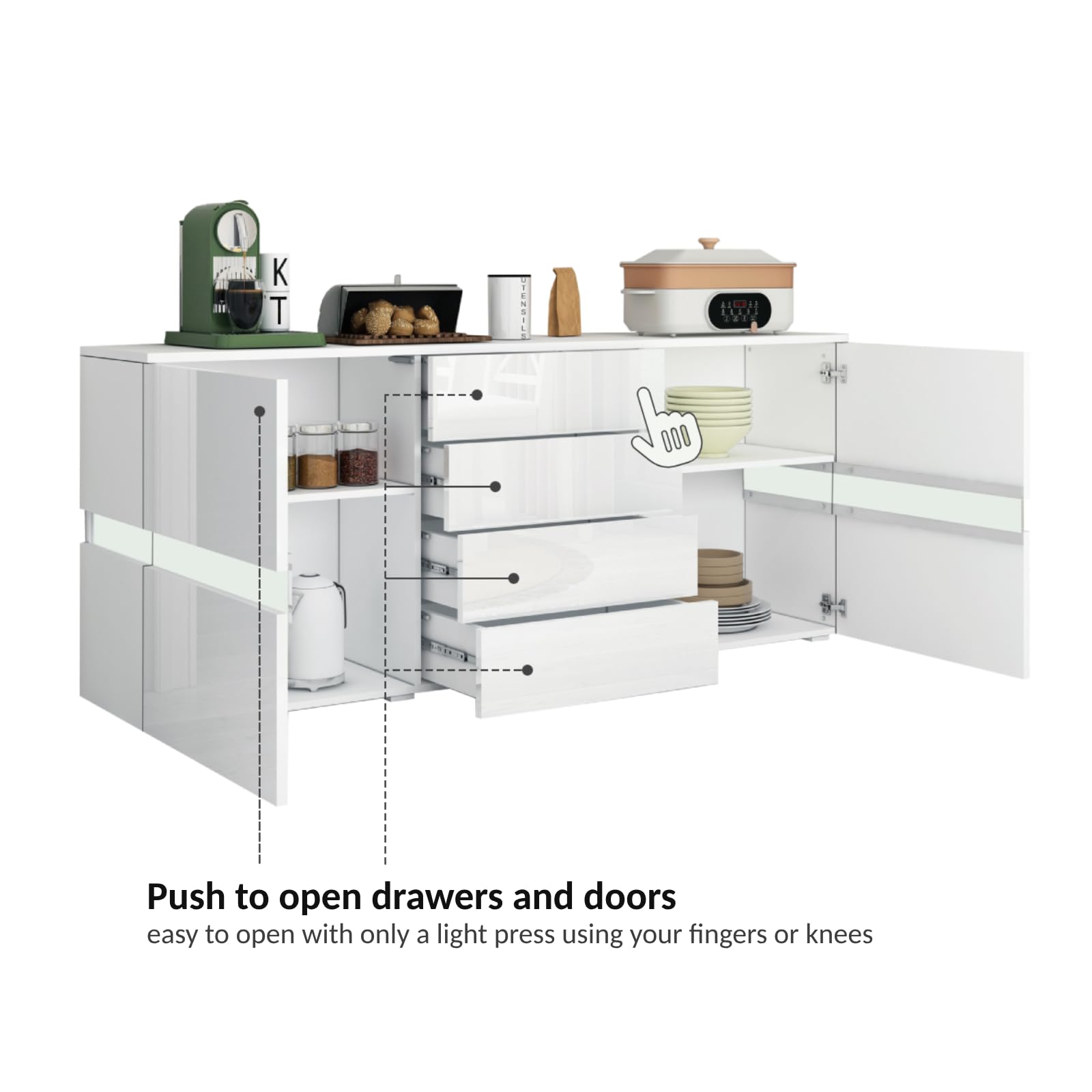 Miawtro Sideboard Mit LED-Beleuchtung - Hochglanz Kommode 140cm Mit 4 Türen & Staufächern