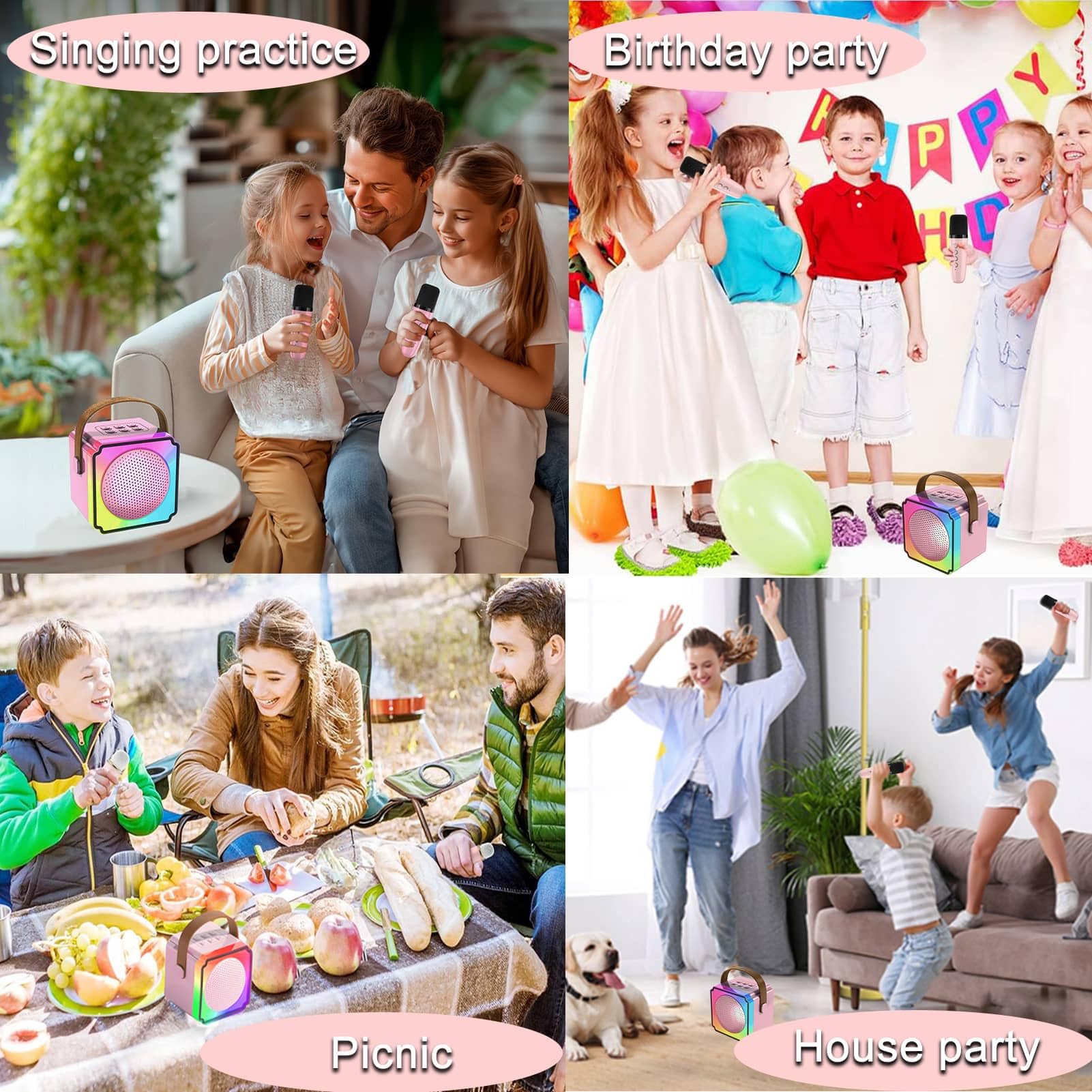 Alter, diese Karaoke-Maschine bringt die Party in jedes Zuhause! Mit zwei kabellosen Mikrofonen kann sofort losgesungen werden - die Mikrofone sind wiederaufladbar und halten nach dem Aufladen 1-2 Stunden durch. Einfach einschalten und die Mikrofone verbinden sich automatisch mit dem Lautsprecher. Der Sound ist überraschend laut und klar - egal ob drinnen oder draußen. Aber das ist noch nicht alles: Die Maschine hat 4 magische Stimmeffekte, mit denen du deine Stimme verändern kannst! Dazu bunte LED-Lichter in 6 verschiedenen Modi, die zur Musik tanzen. Du kannst nicht nur Karaoke singen, sondern auch Musik über Bluetooth, TF-Karte, USB-Stick oder AUX abspielen. Mit Lederarmband ist die Maschine leicht zu tragen - perfekt für Partys, Ausflüge oder einfach nur zum Spaß haben. Das niedliche Design in Rosa begeistert besonders Kinder. Das ideale Geschenk für Jungen, Mädchen und alle, die gerne singen! Achtung: Mikrofone und Lautsprecher nicht zu nah beieinander platzieren, sonst gibt's Feedback.