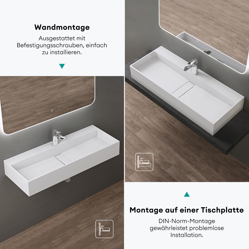 Planst du ein neues Badezimmer? Dieses doporro Waschbecken aus Mineralguss ist ein echter Hingucker! Mit 100x48cm Größe bietet es viel Platz zum Händewaschen und eine große Ablagefläche für Seife, Zahnbürsten und Kosmetik.
