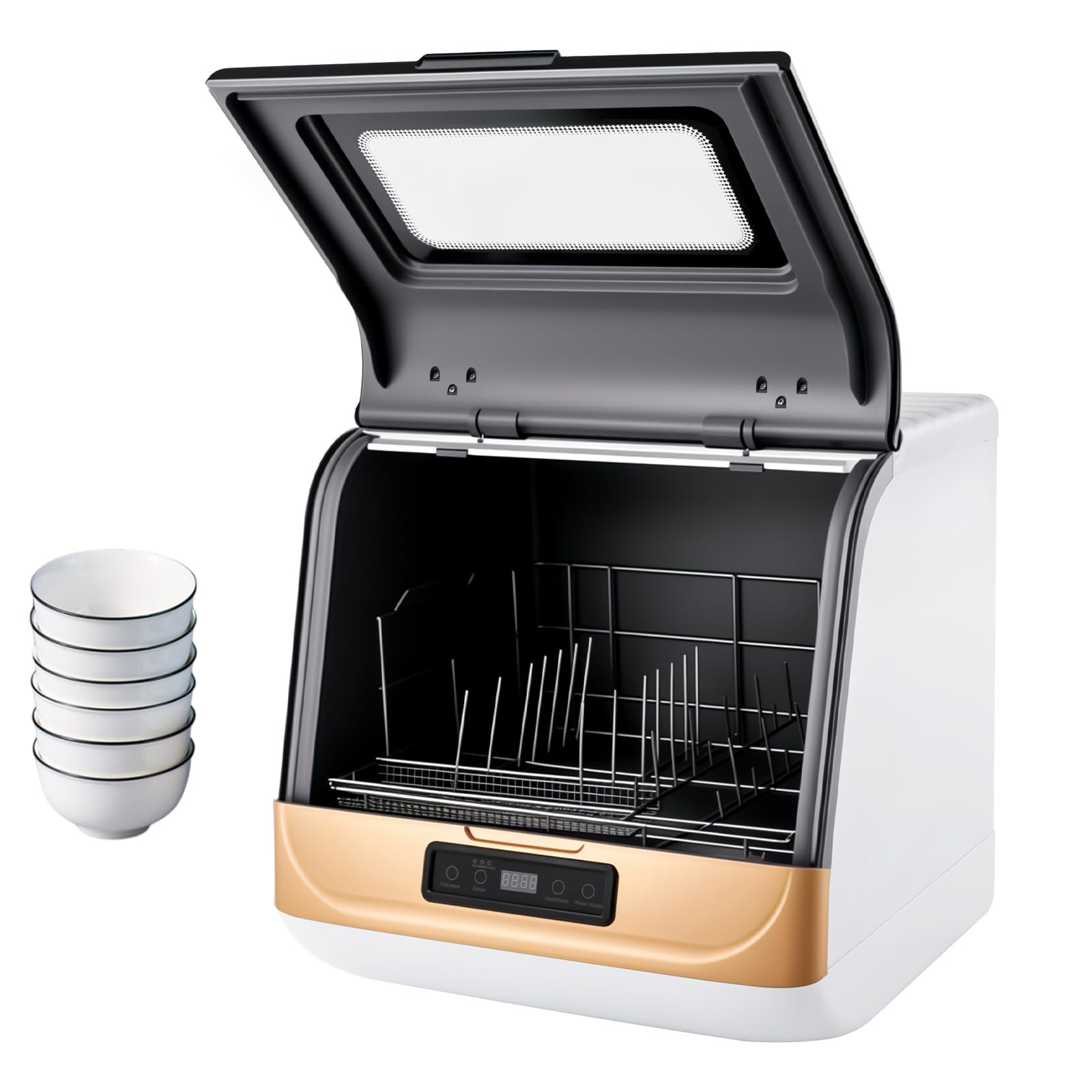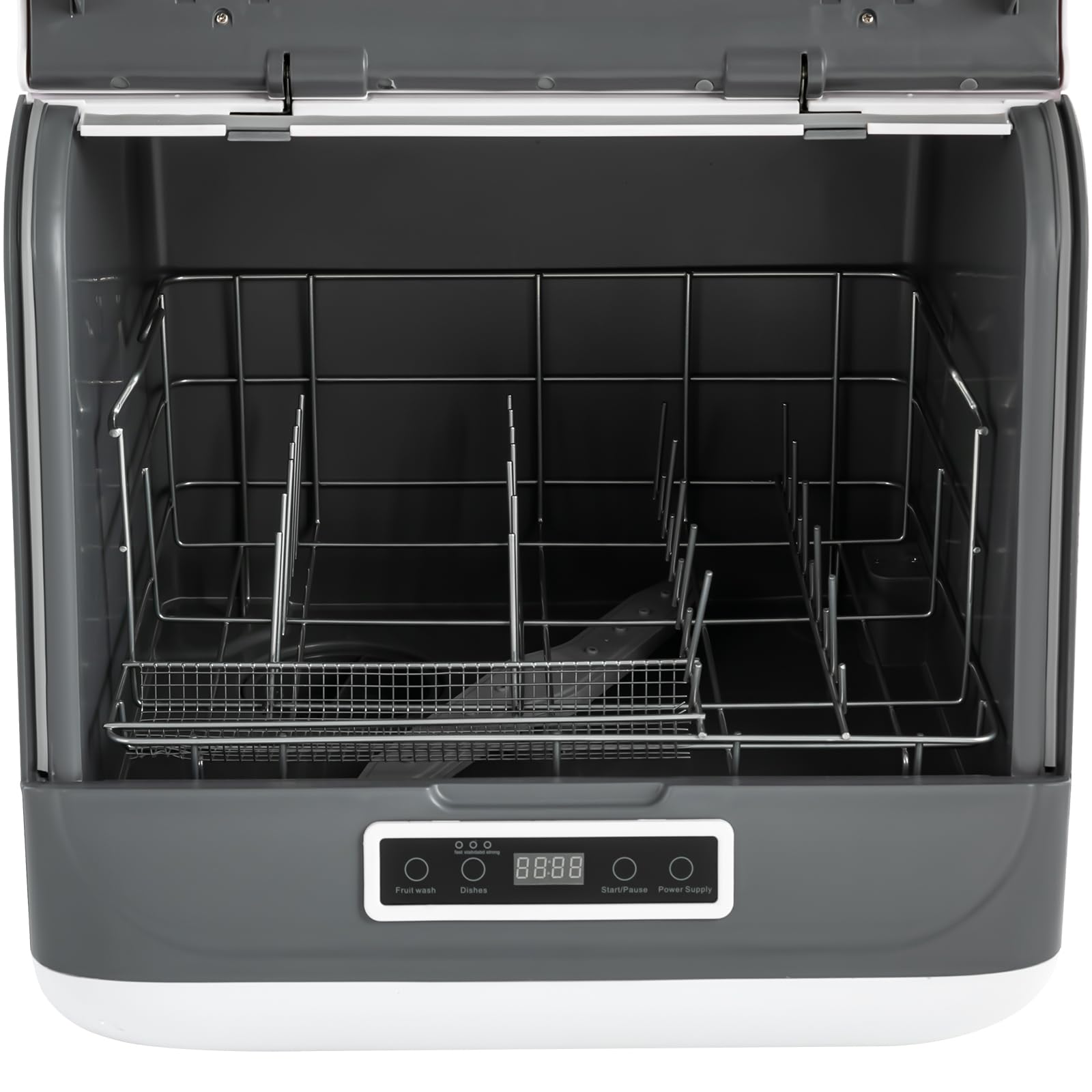 Alter, dieser Mini-Geschirrspüler ist ja praktisch! Passt auf jeden Tisch und hat 3 Programme: Schnellwaschen (30 Min., 55°C), Normal (40 Min., 60°C) und Intensiv (50 Min., 65°C). Mit Auto-Trocknung - das Geschirr kommt trocken und sauber raus. Die 360° Sprüharme waschen richtig gründlich - kein langes Nachspülen nötig. Kapazität: 4-6 Gedecke (12-20 Teile) - ideal für Singles, Paare oder kleine Familien. Super für Wohnheime, Büros, Wohnmobile, Boote oder Camping. Nur 45x40x44,8 cm klein - passt fast überall hin. Mit LED-Display siehst du immer was los ist. Klappdeckel oben - einfach zu beladen. Aus PP, ABS und Edelstahl - gute Qualität. Verbraucht 800W bei 220V - normale Steckdose reicht. Der herausnehmbare Filter macht die Reinigung easy. Die Hochtemperatur-Trocknung killt Bakterien und Schimmel - alles hygienisch sauber. Auch Restwärme-Trocknung möglich - spart Energie. Wenn du wenig Platz hast aber trotzdem nicht von Hand spülen willst, ist das Ding perfekt. Einfach aufstellen, anschließen - und schon hast du mehr Freizeit!