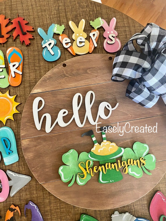 Deine Tür wird zum Blickfang! Dieses Holz-Schild mit 15 verschiedenen Anhängern kannst du je nach Jahreszeit wechseln. Ob Weihnachten, Halloween oder Frühling - immer die passende Dekoration. Mit niedlichen Hundemotiven für eine persönliche Note. Einfach zusammenstecken - keine Werkzeuge nötig. Aus robustem Holz für innen und außen. Mach dein Zuhause einladend und gemütlich. Perfekt als Geschenk für Hausbesitzer oder alle die ihre Tür individuell gestalten wollen!