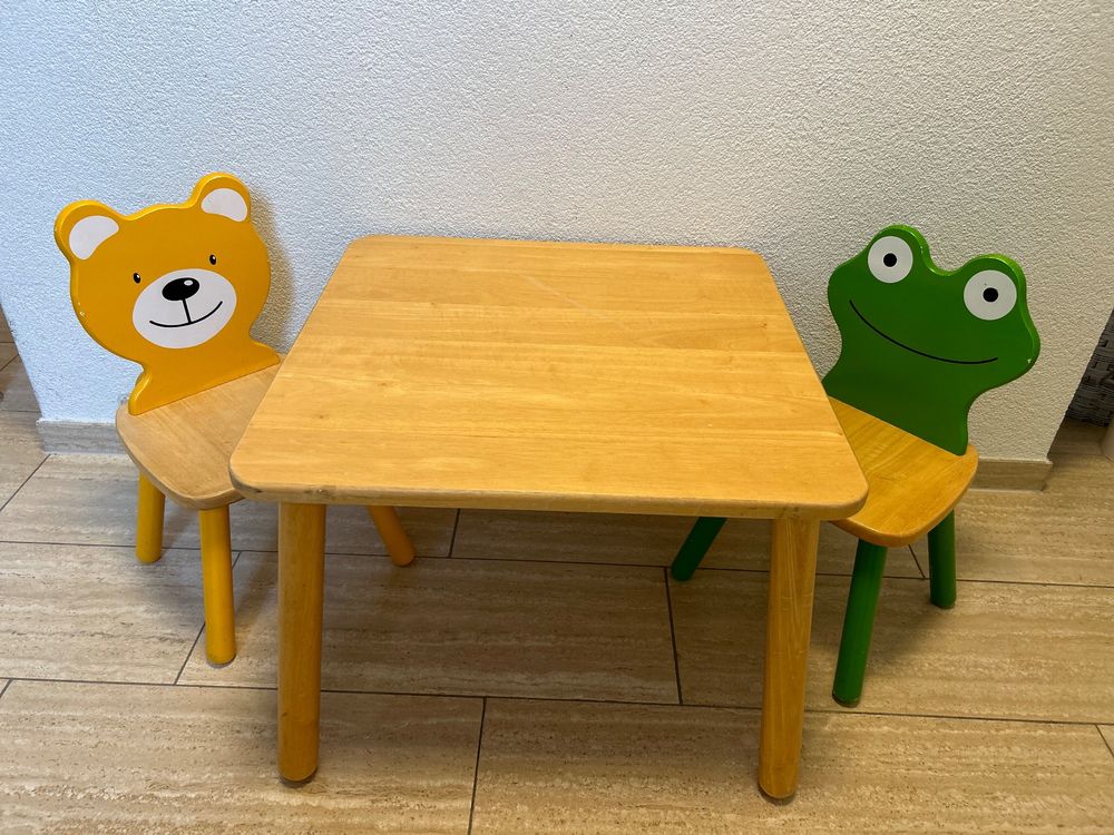 Der perfekte Platz für kleine Künstler! Dieser niedliche Kindertisch mit 2 passenden Stühlen lädt zum Malen, Basteln und Spielen ein. Aus stabilem Kiefernholz gefertigt - natürlich und langlebig. Tischmaße: 60x60x43cm, Stühle: 32,5x31x50cm. Für Kinder von 3-7 Jahren ideal. Maximale Belastung: Tisch 10kg, jeder Stuhl 30kg. Das schlichte Design passt in jedes Kinderzimmer. Perfekt für Maltreffen mit Freunden, Puzzle-Sessions oder die tägliche Brotzeit. Leicht zu reinigen und super stabil. Schafft eine gemütliche Ecke für kreative Stunden. Ein Geschenk das garantiert Freude macht! Hol dir die Basis für unendliche Spielideen - deine Kinder werden es lieben!