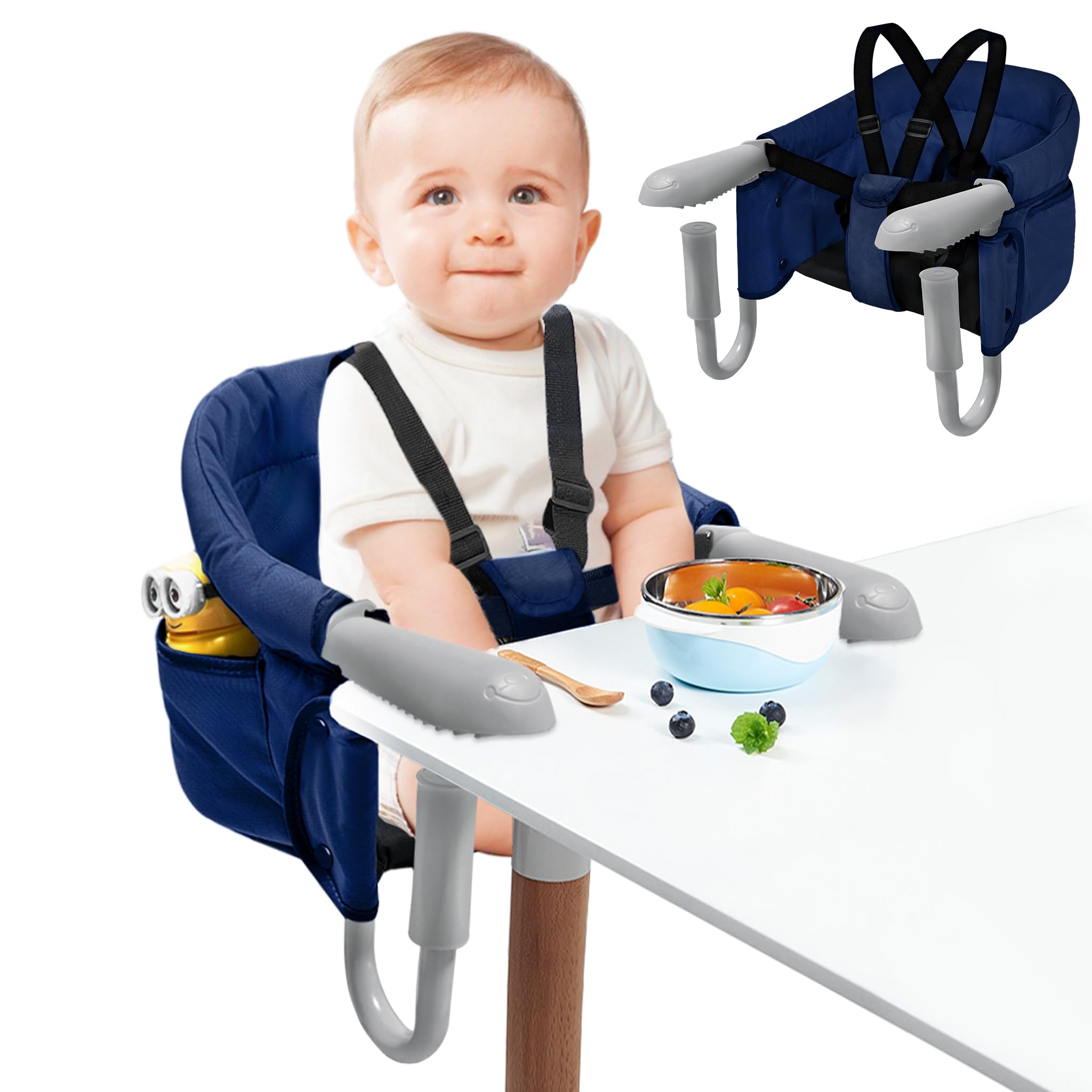 Features: 3-Punkt-Sicherheitsgurt, rutschfeste Klemmen für Tischstärken von 2-8cm, abnehmbarer und waschbarer Sitzbezug. Die seitliche Aufbewahrungstasche ist perfekt für Schnuller, Fläschchen oder Spielzeug.