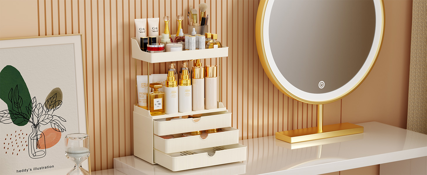 Maße: 32,5 x 17,9 x 43,9 cm - perfekt für jeden Schminktisch. Oben findest du Platz für Parfums, Hautpflege und Cremes, während in den 3 Schubladen Lidschatten-Paletten, Sonnenschutz und Co. sicher verstaut sind.