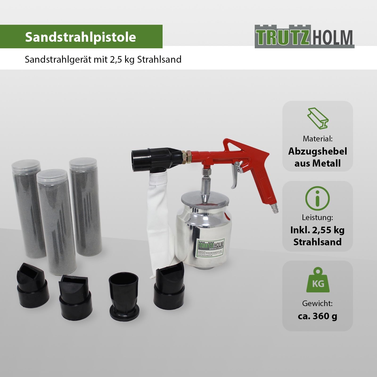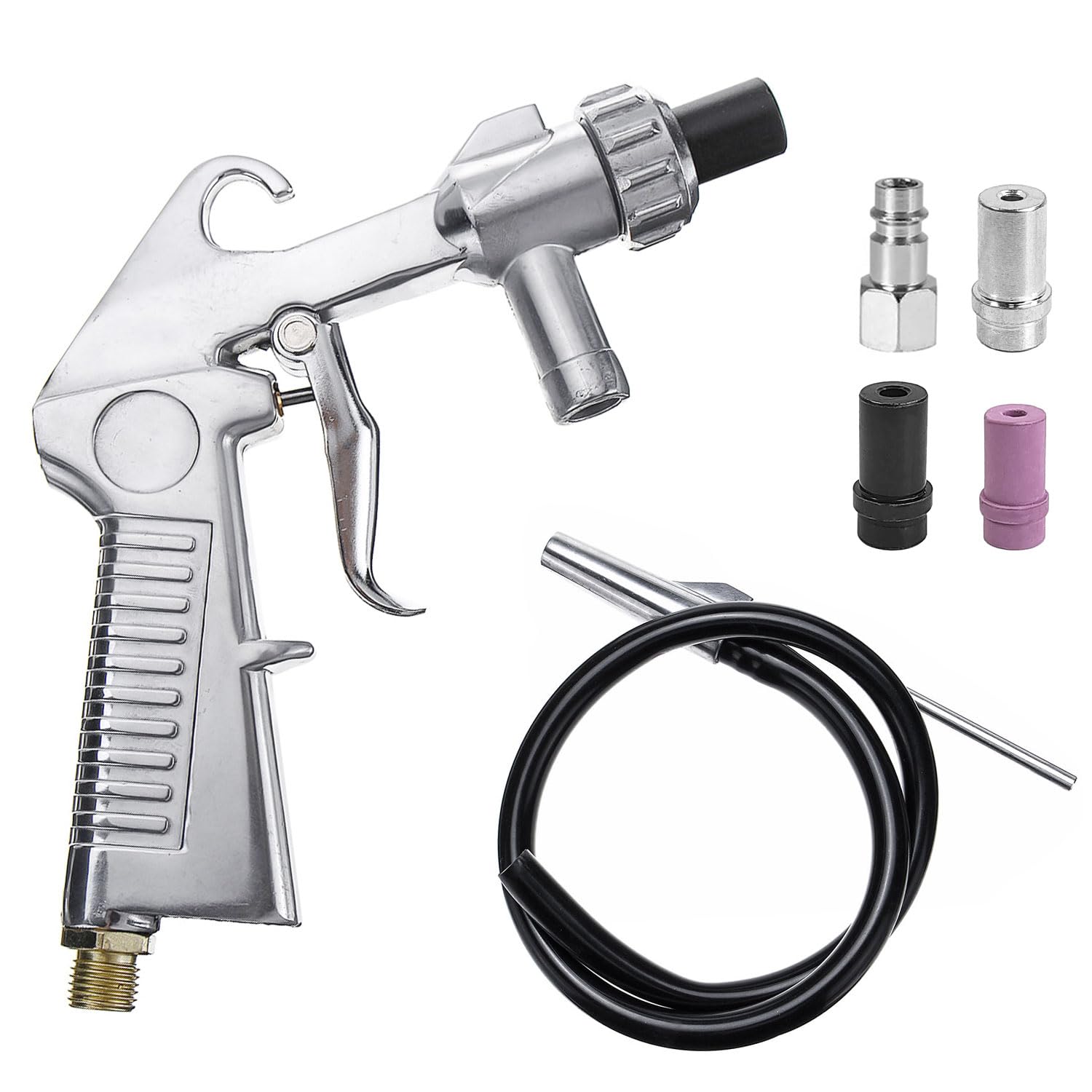 Professionelle Reinigungsergebnisse für Heimwerker und Profis! Dieses komplette Sandstrahl-Set macht das Entfernen von Rost, das Polieren von Oberflächen und das Reinigen von Metallteilen zum Kinderspiel. Die pneumatische Strahlpistole arbeitet mit einem Luftdruck von 60-120 psi und sorgt für einen kontinuierlichen Strahlmittelfluss. Im Set enthalten sind 4 verschiedene Düsen: 2 schwarze Stahldüsen mit 6mm, 1 silberne Stahldüse mit 5mm und 1 Keramikdüse mit 6mm - für unterschiedliche Anforderungen genau das Richtige! Der Griff aus Aluminiumlegierung liegt auch bei langen Arbeiten angenehm in der Hand. Mit 105cm Schlauchlänge hast du genug Reichweite für deine Projekte. Leicht und kompakt ist das Set einfach zu transportieren und zu verstauen. Perfekt für die Reinigung von Zäunen, Metallfelgen, Werkzeugen und vielen anderen Oberflächen. Denk immer an den Sicherheitsschutz - Brille nicht vergessen! Ein unverzichtbares Werkzeug für jede Werkstatt.