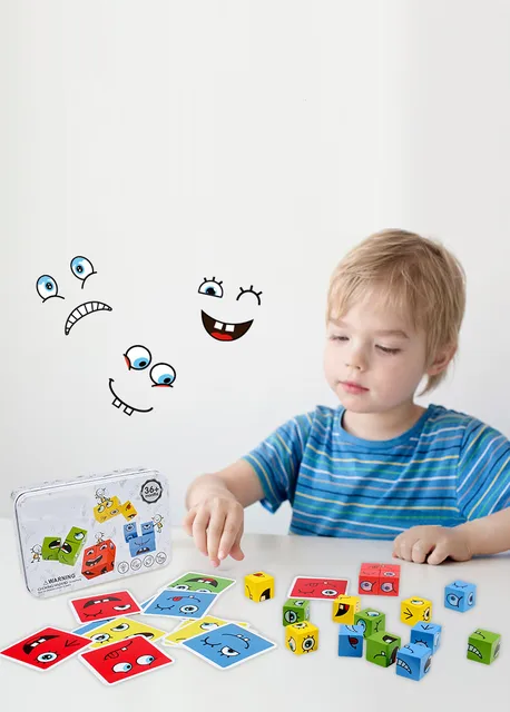 Das Face Change Cube Puzzle ist total lustig und macht süchtig! Mit 16 Holzblöcken und 64 verschiedenen Gesichtskarten können Kinder unendlich viele lustige Gesichter zusammenbauen. Einfach eine Karte ziehen und dann versuchen, das Gesicht so schnell wie möglich nachzubauen.