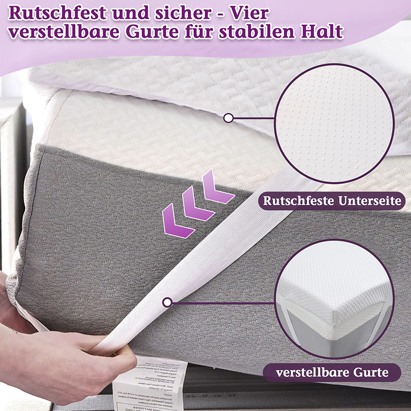 Endlich wieder richtig durchschlafen! Unser cleverer 2-in-1 Topper bietet dir zwei verschiedene Liegegefühle in einem Produkt. Auf der einen Seite wartet weicher Gel-Viscoschaum, der sich perfekt an deine Körperform anpasst - ideal für alle, die es kuschelig mögen. Drehst du ihn um, erwartet dich festerer Komfortschaum für optimalen Halt. Egal ob du Seitenschläfer, Bauchschläfer oder Rückenlieger bist - hier findest du deine perfekte Schlafposition! Der atmungsaktive Bezug ist nicht nur hypoallergen und milbenabweisend, sondern hat auch praktische Anti-Rutsch-Noppen unten. So verrutscht nichts mehr nachts! Und wenn's mal Zeit für eine Wäsche wird, einfach den Reißverschluss aufziehen und ab in die Maschine. Alle Materialien sind selbstverständlich schadstoffgeprüft und unbedenklich. Perfekt fürs Boxspringbett, dein Schlafsofa oder auch den Wohnwagen - für erholsame Nächte überall!