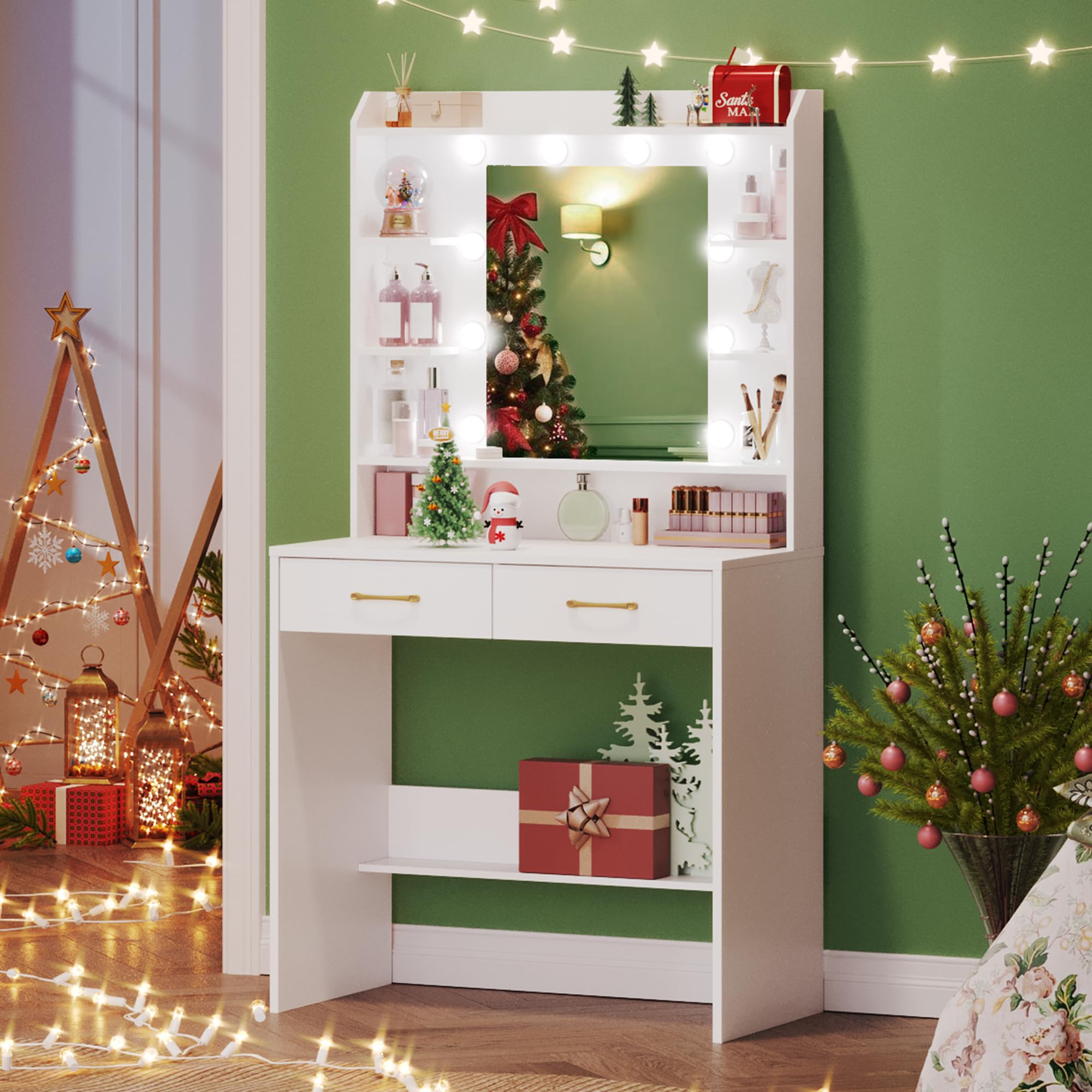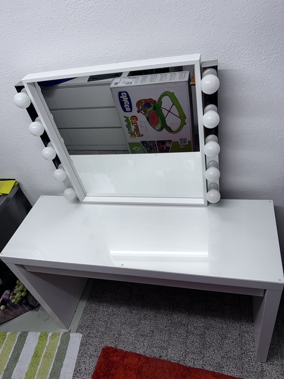 Dein persönliches Beauty-Studio! Dieser elegante Schminktisch ist 140cm hoch und hat eine 50x50cm große LED-Spiegelfläche. Das Licht lässt sich in 3 Farbtemperaturen (warm, natürlich, kühl) und in der Helligkeit stufenlos einstellen. Mit 2 geräumigen Schubladen, Aufbewahrungsbox mit Fächern und speziellen Lippenstift-Haltern. Inklusive weichem, gepolstertem Hocker. Mattweiß mit goldenen Akzenten - sieht total edel aus. Aus stabilem MDF und Spanplatte, 26kg schwer. Einfach aufzubauen, inklusive Kippschutz für die Wand. FSC-zertifiziertes Holz. Das perfekte Geschenk für alle Beauty-Liebhaberinnen!