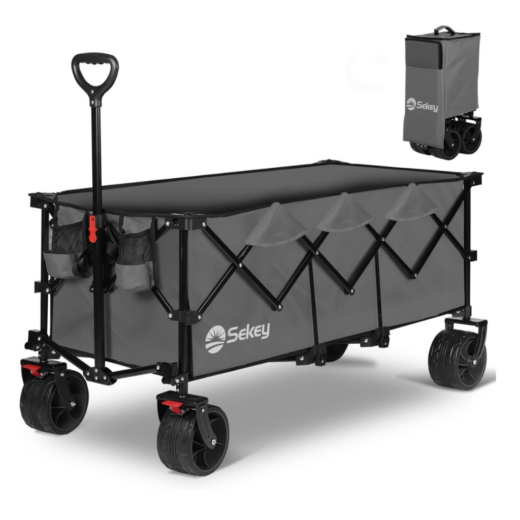 Boah, dieser Bollerwagen ist ein absoluter Game-Changer für alle Outdoor-Fans! Mit riesigen 445 Litern Volumen packst du da einfach alles rein - vom kompletten Camping-Equipment bis zur großen Picknick-Ausstattung. Und das Beste: Er trägt satte 120kg! Also keine Sorge, dass er zusammenbricht, wenn die Kinder mal wieder alle Spielsachen mitnehmen wollen.\n\nWas den Wagen so besonders macht:\n• Mega große 18x10cm Reifen - läuft selbst auf sandigem Boden oder Wiese super leicht\n• Integriertes Dach - perfekter Sonnenschutz für heiße Tage\n• Praktische Bremsen - bleibt sicher stehen, auch am Hang\n• Verstellbarer Griff - für Groß und Klein genau einstellbar\n• X-förmige Stahlkonstruktion - richtig stabil und langlebig\n\nEhrlich gesagt, das Falt-System ist genial! Einfach zusammeklappen und schon passt der Wagen in jeden Kofferraum. Kein langes Rumgefummel mehr beim Verstauen.\n\nSuper praktisch für:\n• Camping-Ausflüge\n• Familien-Picknicks\n• Großeinkäufe\n• Strandtage\n• Festival-Besuche\n• Angeltouren\n\nDie großen Reifen sind wirklich ein Traum - kein Ärger mehr mit holprigen Wegen oder Sand. Und das Dach ist nicht nur für Sonne gut, sondern schützt auch vor leichtem Regen.\n\nDas Material fühlt sich richtig hochwertig an - 600D Polyester, das hält was aus. Und das Schutznetz ist super, damit unterwegs nichts rausfällt.\n\nAlso, wenn du öfter mal was transportieren musst oder gerne outdoor unterwegs bist, ist dieser Bollerwagen echt eine Investition wert. Spart so viel Schlepperei und Nerven! Egal ob du zum See fährst, campen gehst oder einfach nur den Wocheneinkauf erledigst - mit diesem Teil wird alles viel entspannter. Der macht einfach Laune!