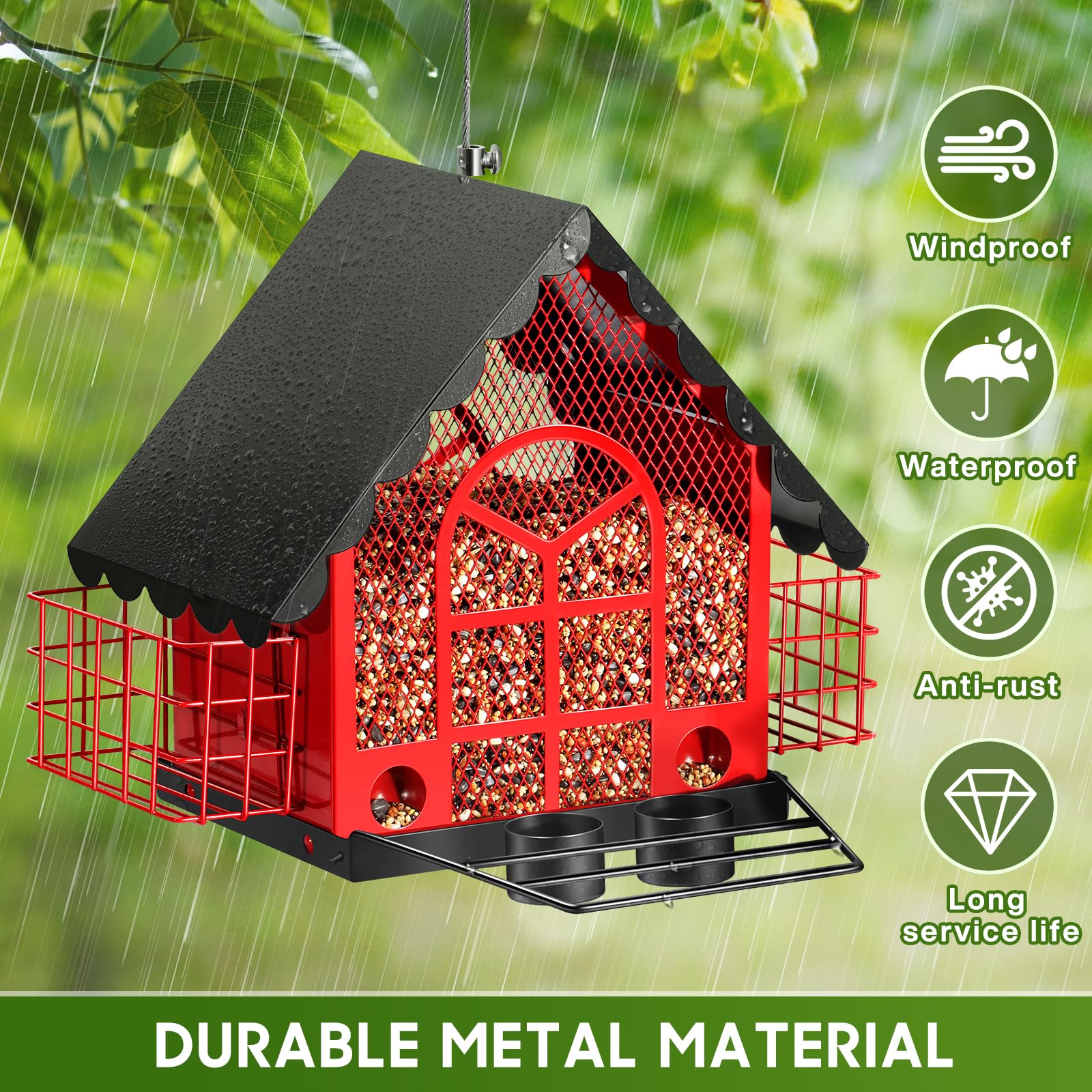 Endlich ein Vogelfutterspender, der wirklich was aushält! Das robuste Metallgehäuse mit Rostschutzlackierung macht diesem Futterspender so schnell kein Wetter etwas aus - ob pralle Sonne, Regen oder Schnee. Besonders clever: Der schraubverstärkte Boden verhindert, dass freche Eichhörnchen den Deckel aufhebeln und sich an den Leckereien bedienen. Das geneigte Dach hält die Samen auch bei Regen trocken, während die 6 Drainagelöcher im Boden für eine gesunde Futterumgebung sorgen. Mit den beiden integrierten Wasserbechern können deine gefiederten Freunde ganz in Ruhe trinken, ohne dass die Samen nass werden. Das abnehmbare Dach und die große Öffnung machen das Befüllen super einfach, und durch das Sichtfenster behältst du immer den Überblick, wann Nachschub fällig ist. Perfekt für alle Vogelliebhaber, die den ganzen Tag über Vogelgezwitscher genießen möchten! Übrigens: Die knallrote Farbe lockt die verschiedensten Vogelarten in deinen Garten. Ein tolles Geschenk für Naturfreunde - ob zu Weihnachten, Geburtstagen oder einfach so. Mit 30 Tage Rückgaberecht und lebenslanger Garantie machst du hier garantiert nichts verkehrt.