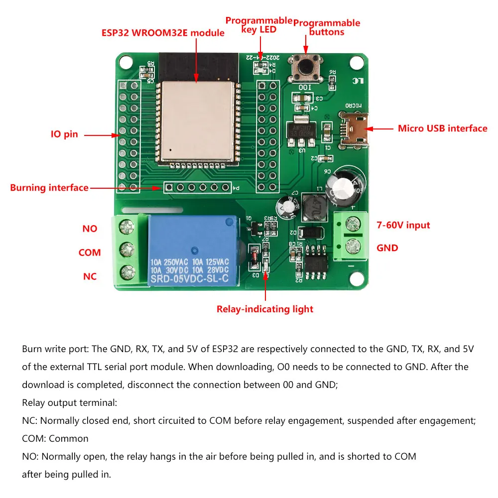 Das ESP32-WROOM-32E Modul hat 4MB Flash-Speicher. Alle I/O-Ports sind nach außen geführt für einfache Entwicklung. Schaltet Lasten bis 250V AC oder 30V DC - perfekt für Lampen, Motoren oder andere Elektrogeräte.
