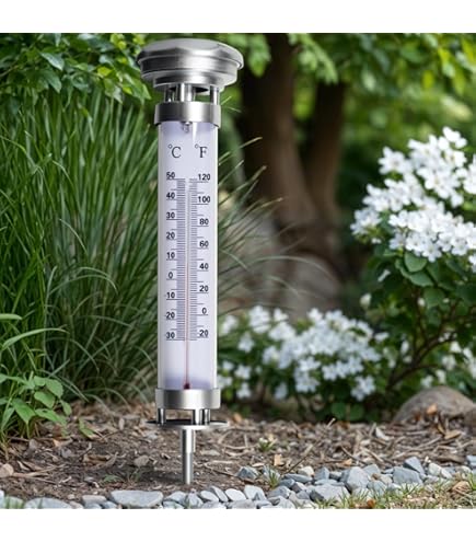 Bring Charme in deinen Garten! Dieses wunderschöne Sonnenblumen-Thermometer (40,2 Zoll Gesamtlänge) misst zuverlässig Temperaturen von -30°C bis 50°C. Mit praktischem Erdspieß für Beete oder als Wandthermometer für Terrasse und Balkon. Die mechanische Funktion kalibriert sich automatisch innerhalb von 2-3 Stunden - kein manuelles Einstellen nötig! Das kontrastreiche Ziffernblatt ist auch aus der Ferne gut ablesbar. Wetterfestes Metall in hübscher Sonnenblumen-Optik. Ein echter Hingucker, der sowohl nützlich als auch dekorativ ist!