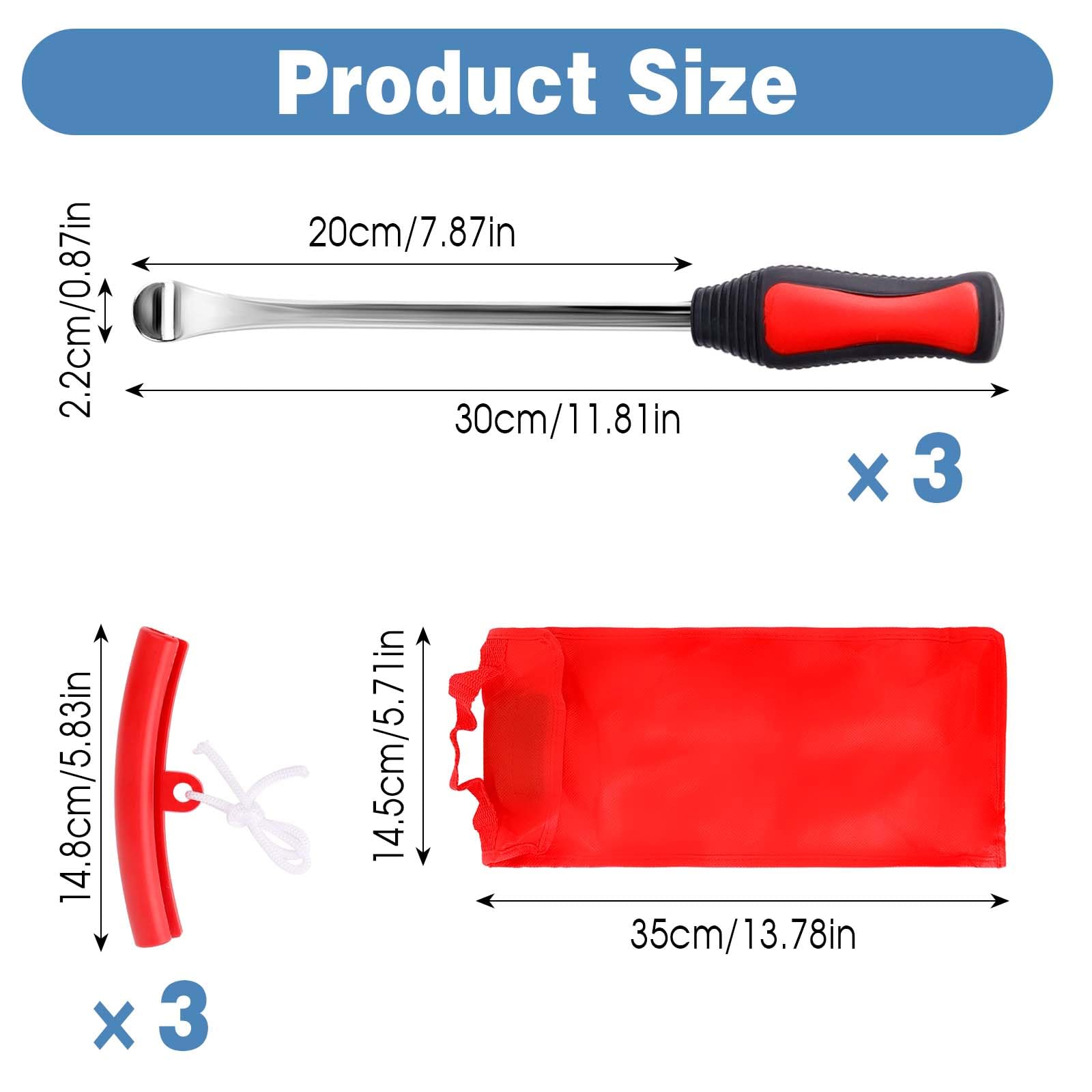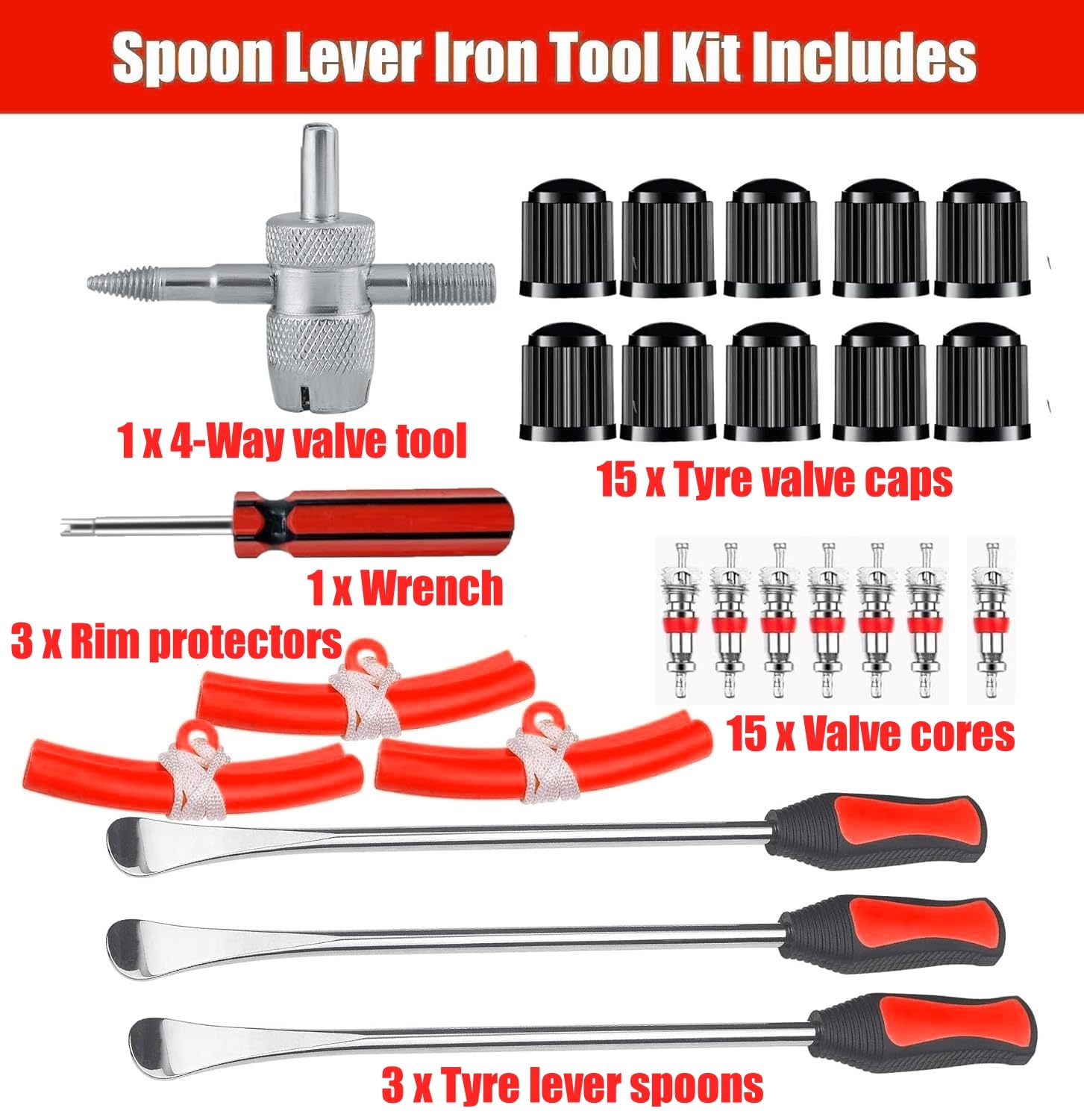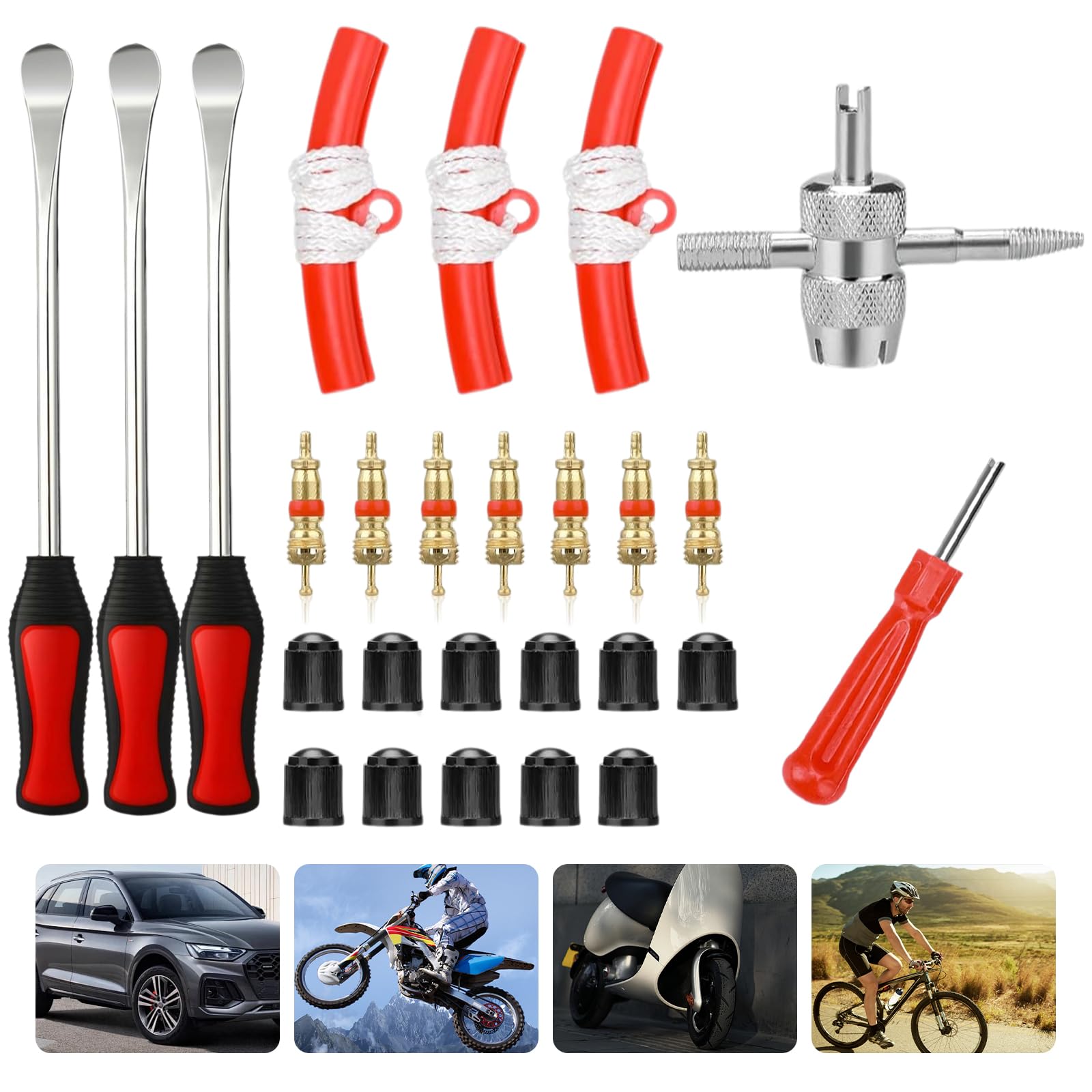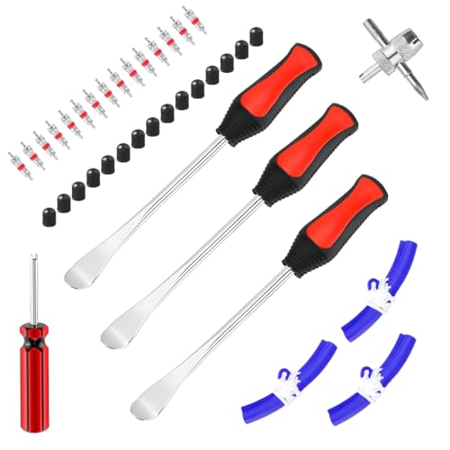 Schrauber-Herz, was willst du mehr? Dieses 29-teilige Reifenmontier-Set hat alles, was du für den Reifenwechsel an Motorrad, Fahrrad & Co. brauchst. Nie wieder Kratzer auf den Felgen!\n\nIm Set enthalten:\n• 3 Reifenheber (ca. 29,5cm lang)\n• 3 Felgenschützer\n• 1 Kreuzschlüssel\n• 1 Ventilschlüssel\n• 8 Ventileinsätze\n• 12 Ventilkappen\n• 1 praktische Aufbewahrungstasche\n\nDas ist Qualität:\n• Reifenheber aus Edelstahl mit rutschfesten Griffen\n• Gebogene Köpfe für einfacheres Reifenabziehen\n• Felgenschützer schützen vor Kratzern\n• Alles sicher verstaut in wasserdichter Oxford-Tasche\n\nSuper für:\n• Motorräder und Fahrräder\n• Geländefahrzeuge und Quads\n• Gartentraktoren und Rasenmäher\n• Schneefräsen und Kleintraktoren\n\nDer Ventilschlüssel macht Luftablassen und Ventilwechsel zum Kinderspiel. Die ergonomischen Griffe liegen perfekt in der Hand - auch bei längeren Arbeiten.\n\nEgal ob du Profi bist oder Hobby-Schrauber: Mit diesem Set meisterst du jeden Reifenwechsel. Endlich kein Ärger mehr mit festgeklebten Reifen oder zerkratzten Felgen!