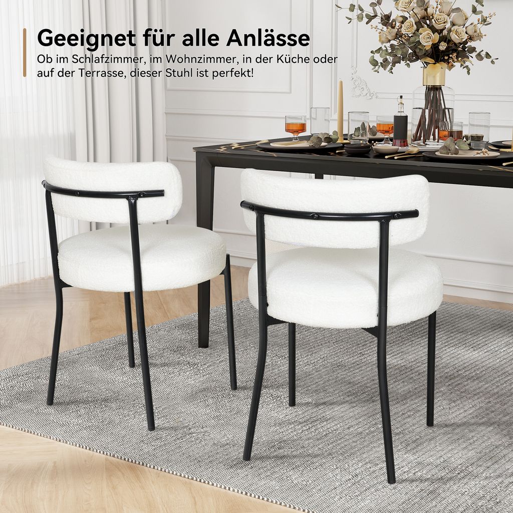 Suchst du gemütliche und stylische Stühle für dein Esszimmer? Dieses 2er-Set in cremeweiß ist genau das Richtige! Die weiche Polsterung mit Fleece-Optik fühlt sich super bequem an und die geschwungene Rückenlehne stützt deinen Rücken perfekt. Mit den robusten Stahlbeinen stehen die Stühle bombenfest und kippeln nicht. Die rutschfesten Fußkappen schützen deinen Boden vor Kratzern - super praktisch! Die Maße von 51x51x76 cm passen an die meisten Esstische und die Belastbarkeit von 120 kg pro Stuhl ist mehr als ausreichend. Das moderne Design harmoniert mit vielen Einrichtungsstilen - ob skandinavisch, modern oder landhaus. Montage ist zwar nötig, aber wirklich einfach gemacht. Perfekt nicht nur fürs Esszimmer, sondern auch als Gästestühle oder fürs Homeoffice. Die Boucle-Optik ist total im Trend und verleiht deinem Zuhause sofort mehr Gemütlichkeit. Einfach hinsetzen und wohlfühlen - so soll Sitzkomfort sein!