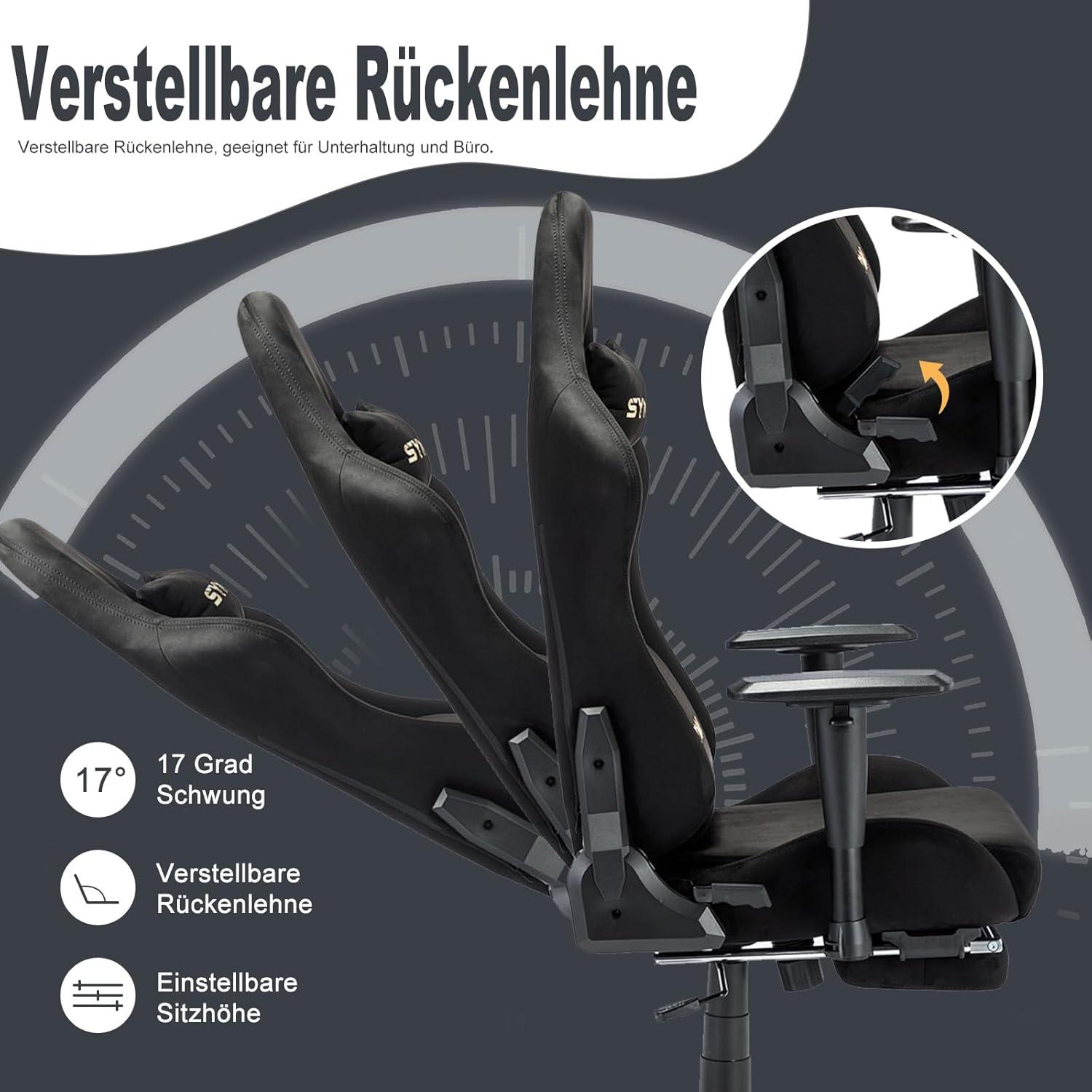 Zockst du stundenlang oder arbeitest du viel am Schreibtisch? Der Symino Gaming Stuhl macht's bequem! Mit verstellbarer Rückenlehne (90° bis 155°) und praktischer Fußstütze kannst du dich richtig zurücklehnen und entspannen. Der Sessel hat ne coole Wildleder-Optik, ist atmungsaktiv und kratzfest – perfekt also für lange Sessions. Der Gaslift lässt sich bis 8 cm verstellen, sodass du die Höhe genau anpasst. Und keine Sorge, der Stuhl trägt bis zu 130 kg! Der Aufbau? Mega easy – in 10-15 Minuten steht er. Falls doch mal was sein sollte, hilft dir unser Kundenservice weiter. Egal ob du zockst, arbeitest oder einfach nur chillst – mit diesem Stuhl sitzt du wie ein Boss. Also, gönn dir was Gutes für Rücken und Nacken und hol dir den Symino. Dein Körper wird's dir danken – versprochen!