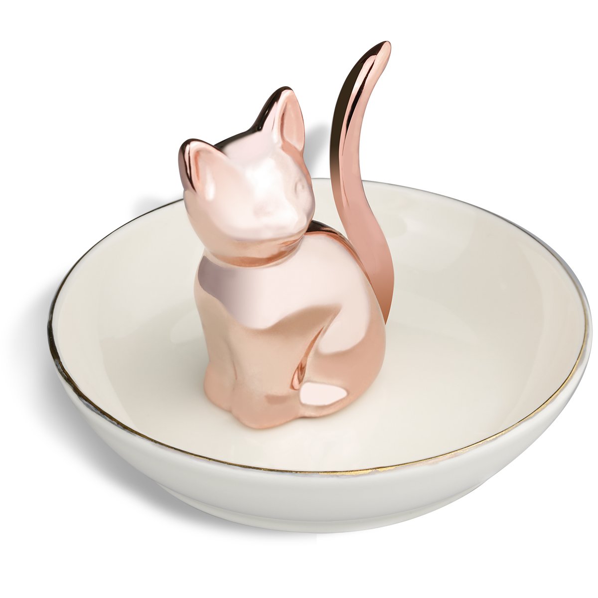 Wie süß ist das denn? Dieser Ringhalter in Form einer goldenen Katze mit langem Schwanz ist nicht nur praktisch, sondern auch ein echter Hingucker. Aus 100 % Keramik gefertigt, mit goldfarbener Oberfläche und weißer Basis. Maße: Scheibe Ø 11,6 cm, Katze 9 cm hoch. Perfekt zum Ablegen von Ringen, Armbändern, Ketten, Ohrringen oder Uhren - ob im Schlafzimmer, Bad oder auf der Kommode. Das niedliche Design macht jedes Zuhause gemütlicher. Ein tolles Geschenk für Katzenfans zu Geburtstag, Muttertag, Valentinstag oder Weihnachten. Schmuckaufbewahrung mal anders!